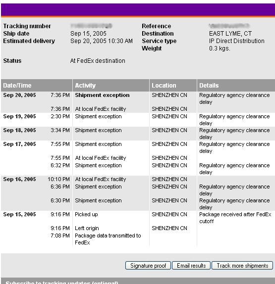 Hello all, first time posting here and first time purchasing an mp3 player. Purchased a 4 GB Black nano with engraving on back. Ordered on my birthday (9/13) and was shipped 2 days later. Problem was, once it go to Fedex, it got stuck in Shenzhen China! I have had a Regulatory Shipping Delay for every day since it was shipped. Been in contact with both Fedex and Apple. Apple has already refunded my shipping (2-3 days). Other than that all I've heard is that its stuck in customs and all I can do is wait. Today I found out from apple that this is happening to most orders coming out of China. Is this true? has anyone else exprienced this? I'll attach a picture of the fedex tracking website. I'm getting a little nervous about this whole thing. Anyone have any thoughts?