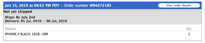 Order Date: Jun 15, 2010 at 08:18 PM PDT Black 32GB