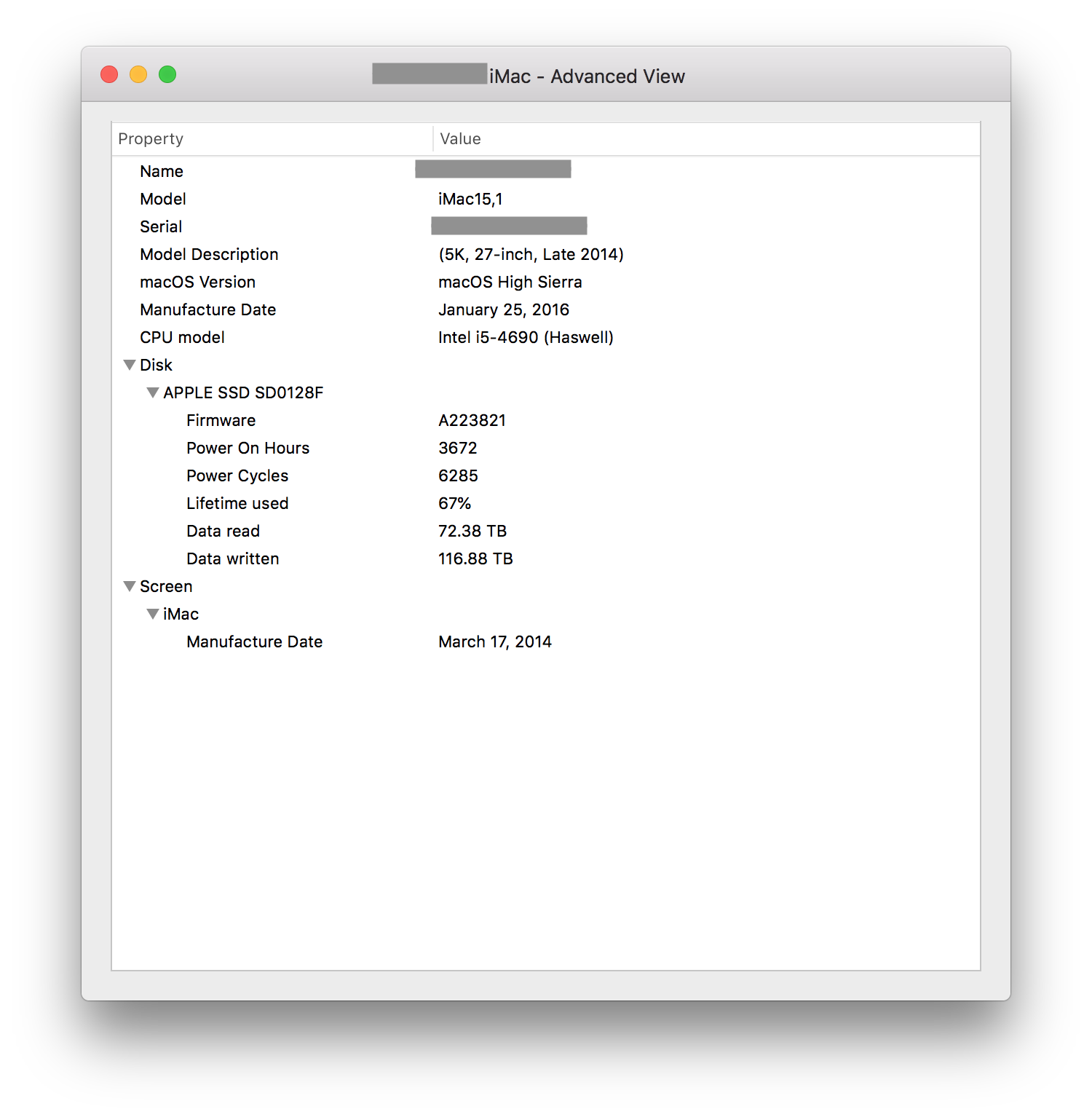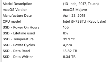 I think it’s weird too. My 128 GB SSD is part of a fusion drive, though, which makes me think maybe it sees a lot more wear as part of the way data is automatically migrated between the HDD and SSD devices? Nothing else seems to be amiss though, so far.How interesting. Here is mine from coconutBattery. I wonder if the hours on is a factor in that calculation?