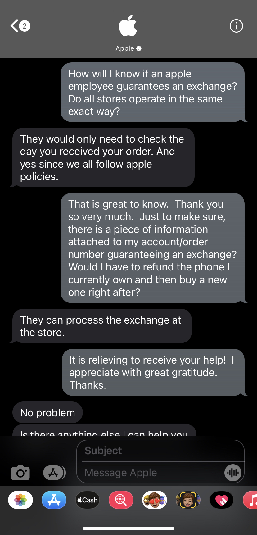 Below are attached screenshots of a conversation I had with an Apple specialist via iMessage. This person stated I could have the possibility of exchanging the phone for the exact same model in perfect pristine quality.