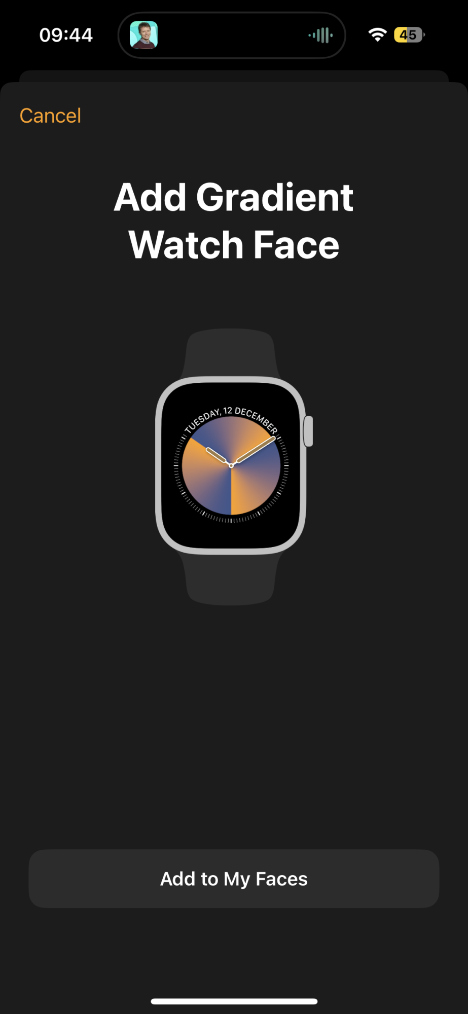 My January Apple Watch Face of the Month! Hitting Daybreak should probably offer to install it. The Gradient watch face is one of the greatest and looks awesome with or without complications. I usually avoid complications except the Today complication. I think a lot of users don't know the Gradient watch face supports a top complication. Style III keeps the color in always-on mode. Add the Sunflower/Abyss (Spring 2021) color combination and it looks so sweet, just like a sunrise!