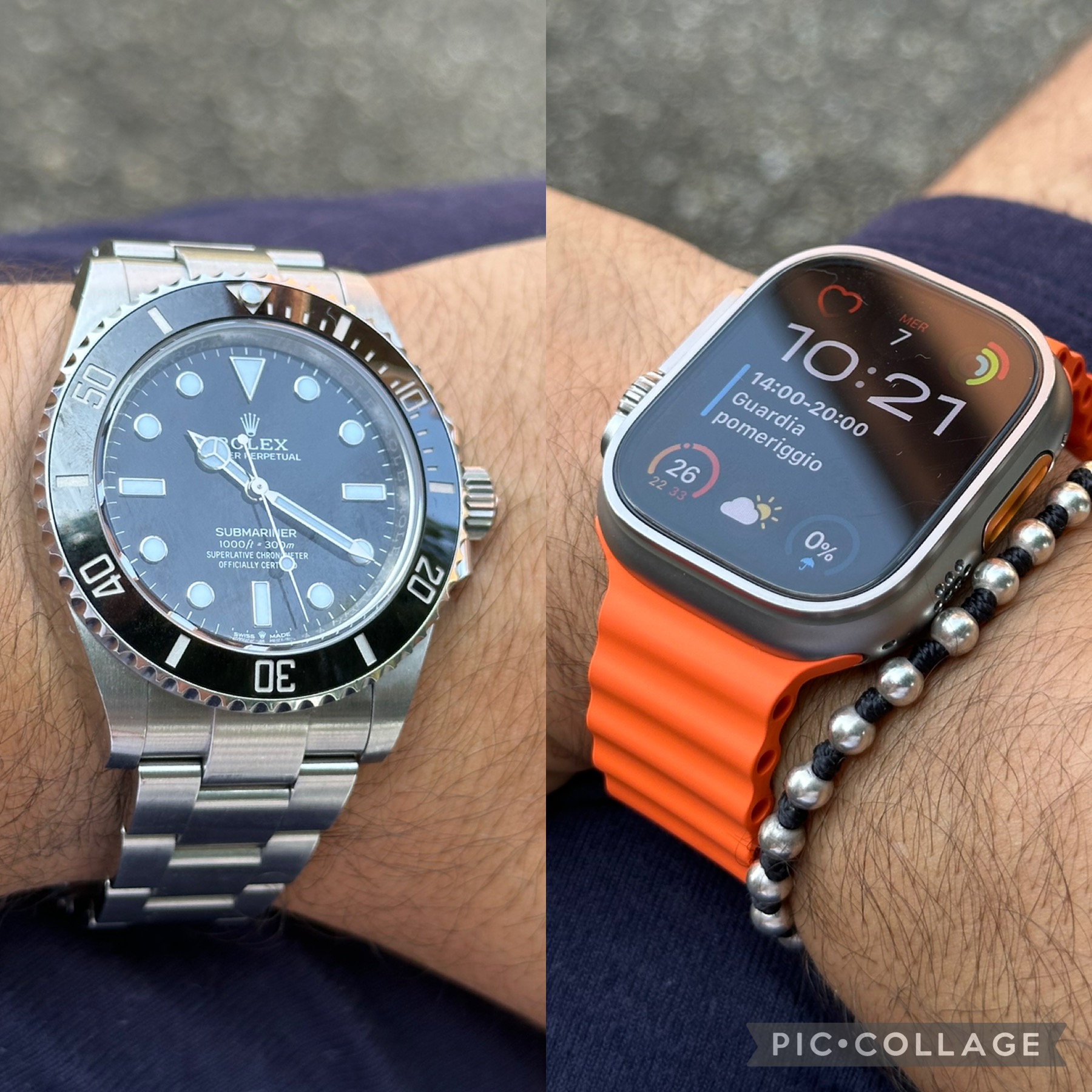 Beautiful Rolex, as a former collector and admirer of mechanical watches, Rolex, omega, breitling, and Cartier I appreciate the beauty of the watches. But due to disabilities, I could no longer wear them as my left hand could no longer activate the self winding mechanism. I then got my first Apple Watch a series 8 aluminum and fell in love with it and that I can wear. Selling off some mechanical watches I now have a new hobby and today I own four Apple watches and approximately 100 bands.Rolex Submariner 124060 on my left wrist, Apple Watch Ultra 2 on the right 🤟🏻