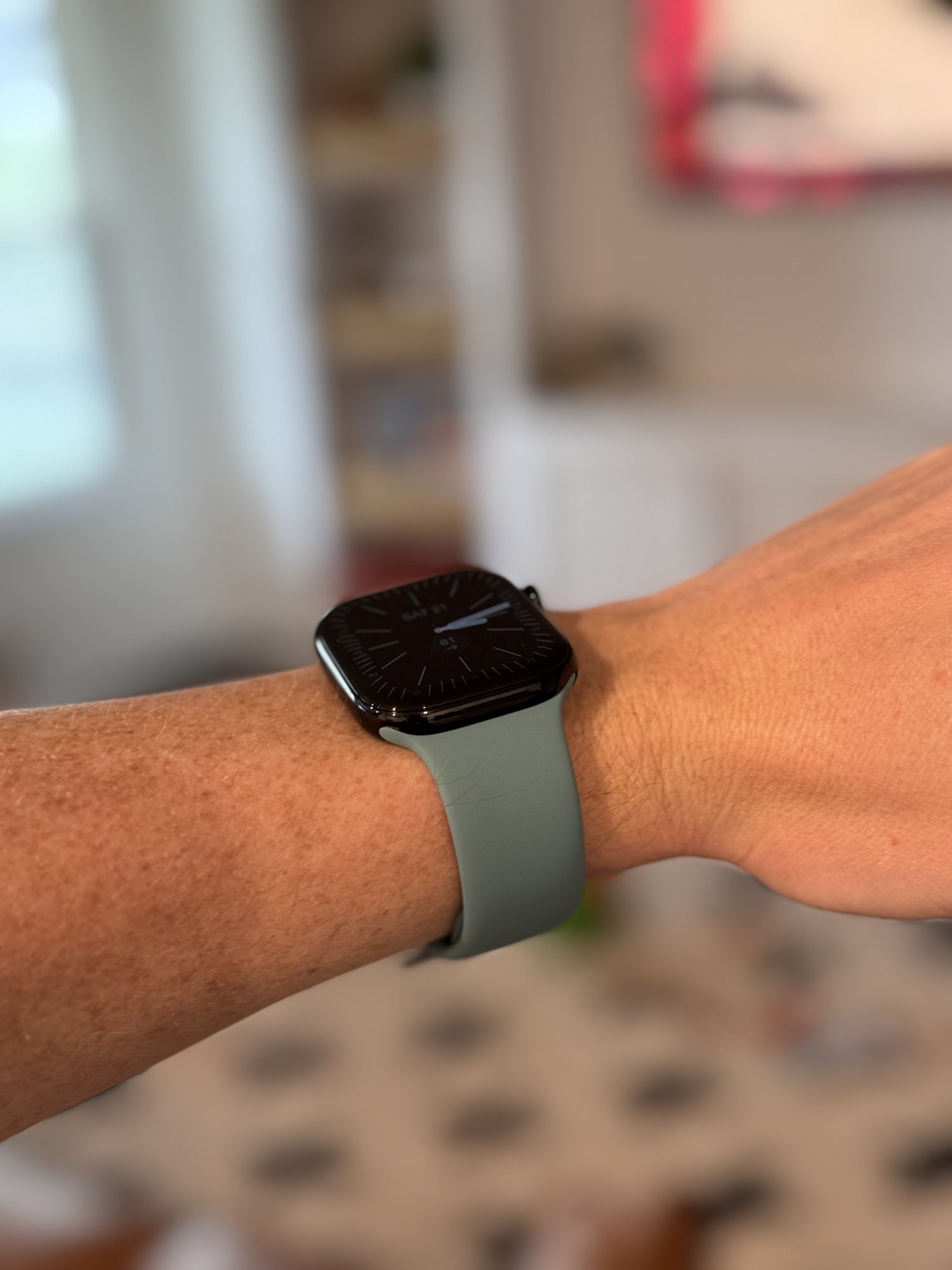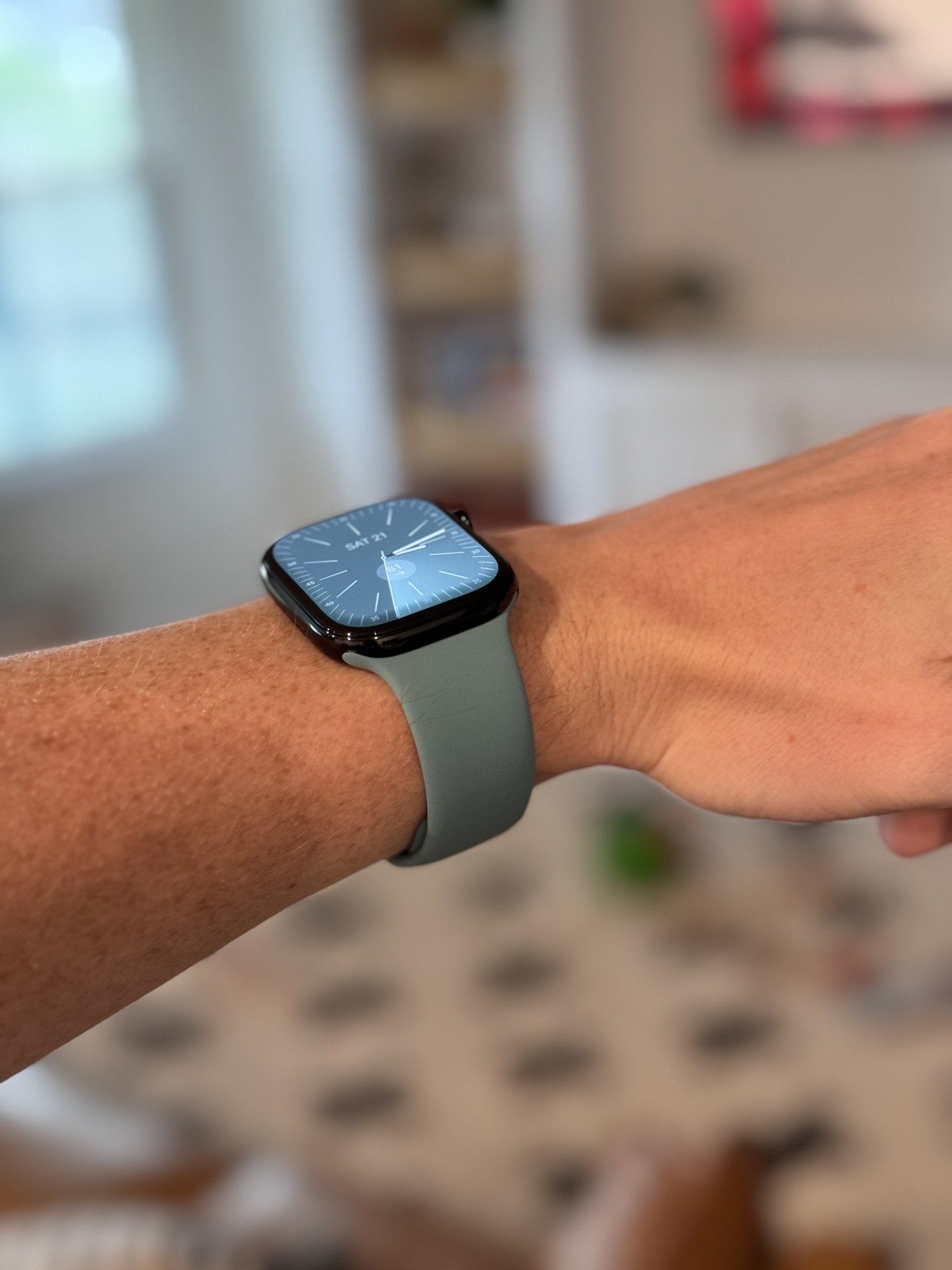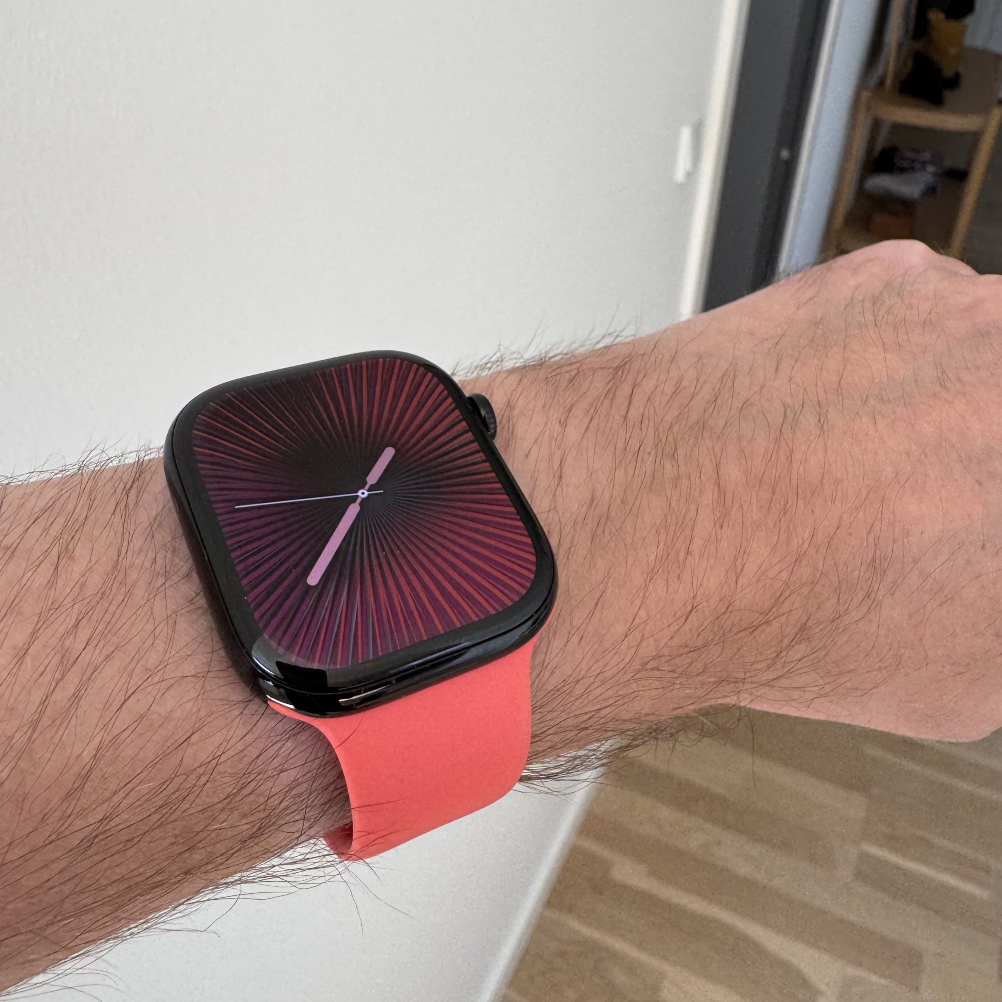 The case dimensions are a step up for me. This years Apple Watch feels like a 'squashed' or 'flattened' Series 7/8/9. It's noticeably thinner but some of that thinness has come at the expense of wider bezels. On the Jet Black though, the bezels just blend in with the rest of the watch case, so it's not a big deal.