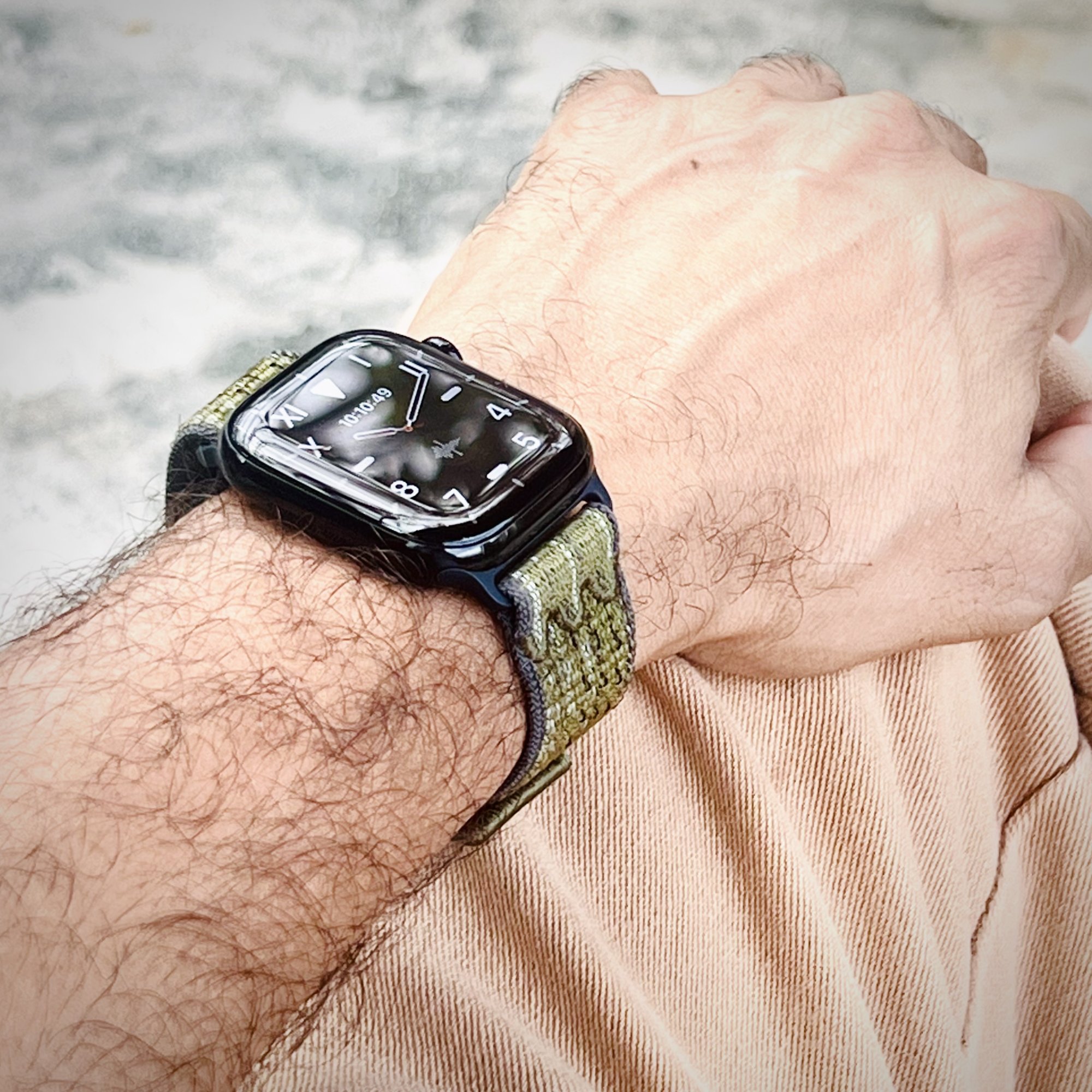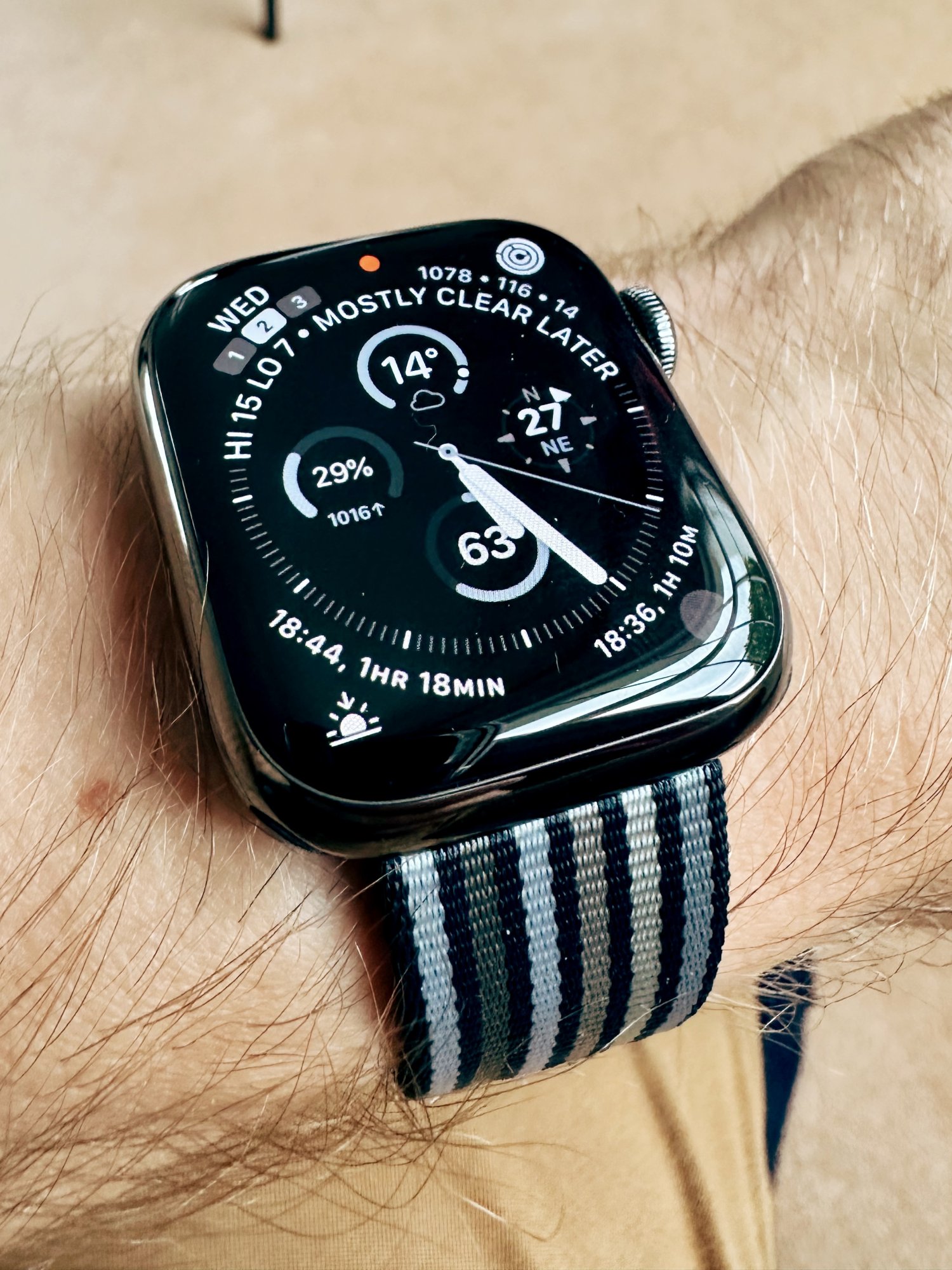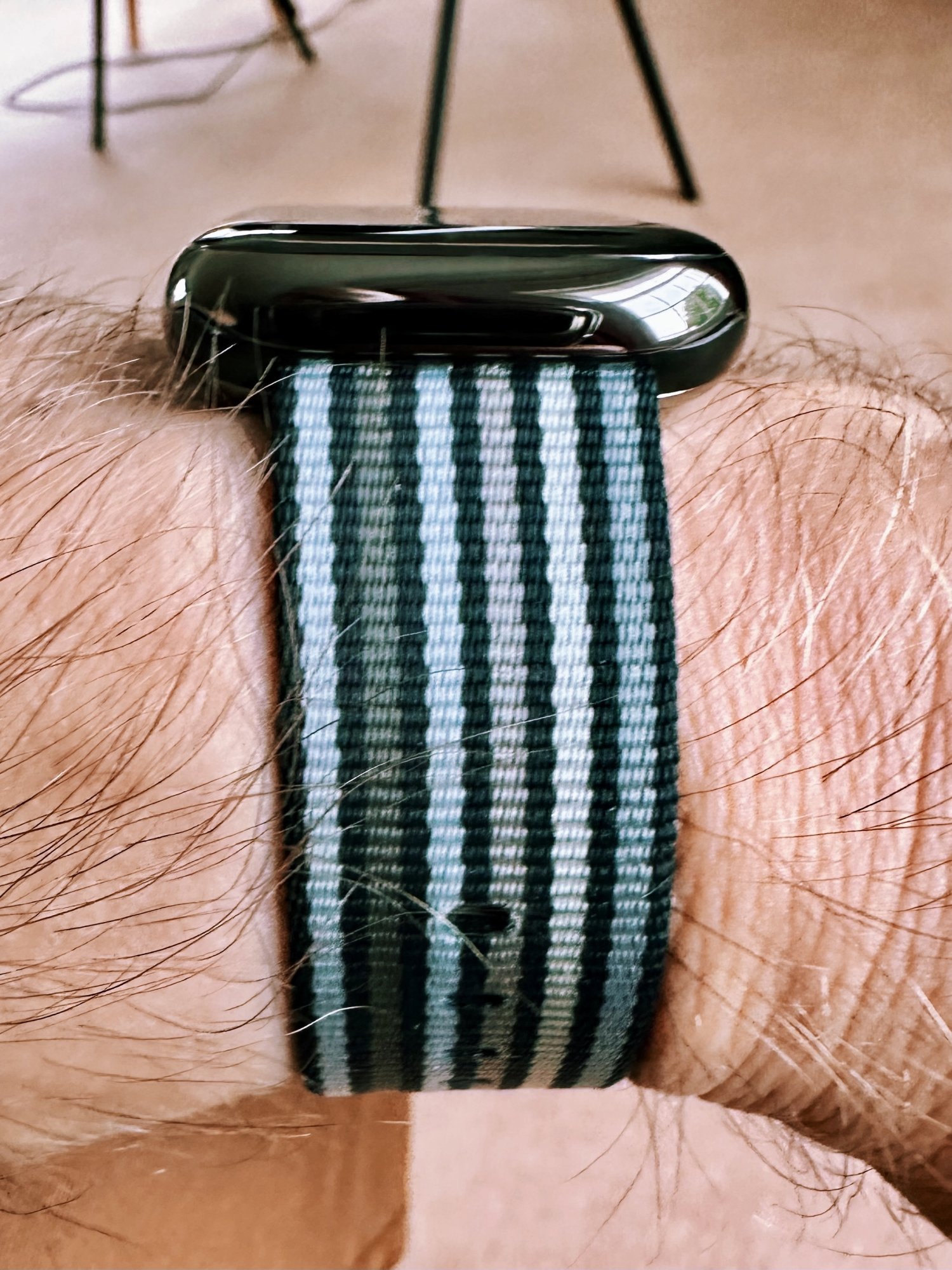 Black stripy woven nylon band on graphite. This is one of the few woven bands with the black aluminium lugs and buckle and pairs very well. Lugs fit the series 7-9 pretty well, with just a small excess sticking out if you’re looking for it - again it’s far more obvious in photos.