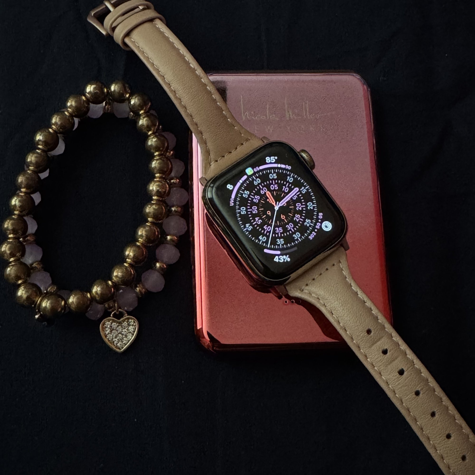 The gold trim is a fantastic match for your gold steel or tatty Apple Watches. Plus, since the pendants are brass and are mostly plastic or resin beads, they won’t scratch your watch. Oh, and I also have a polished pink gradient MagSafe power bank from the same brand. Also used to have a pretty purple flower case from that brand for my space grey iPhone SE years ago.