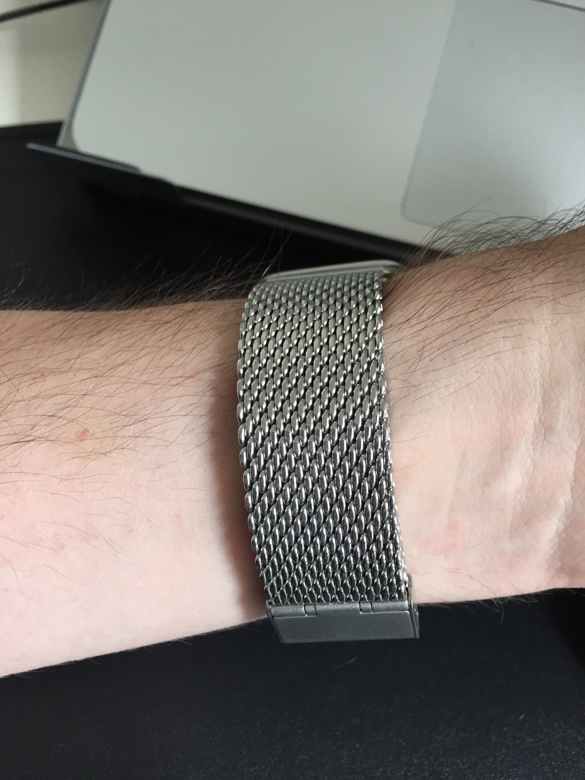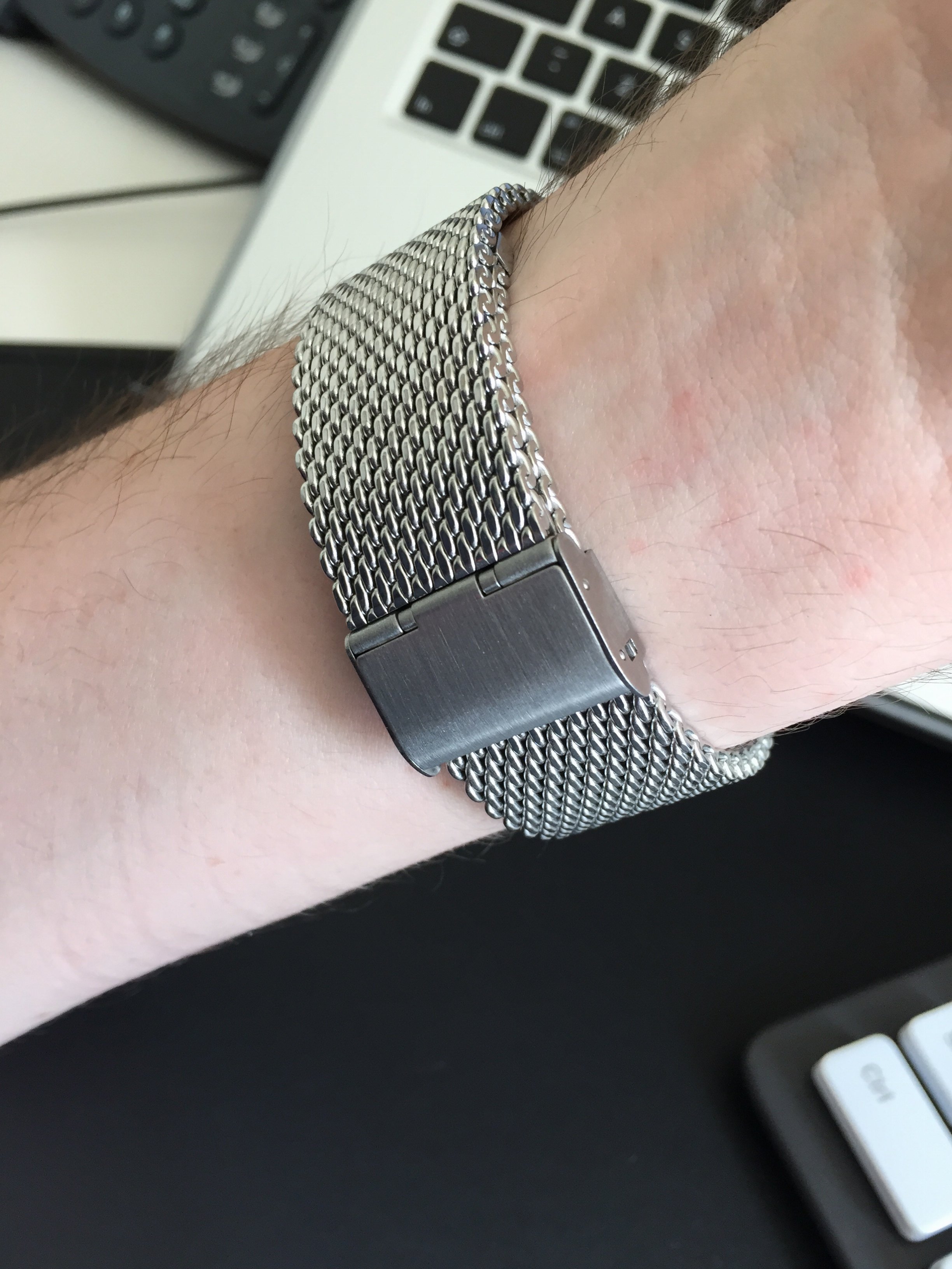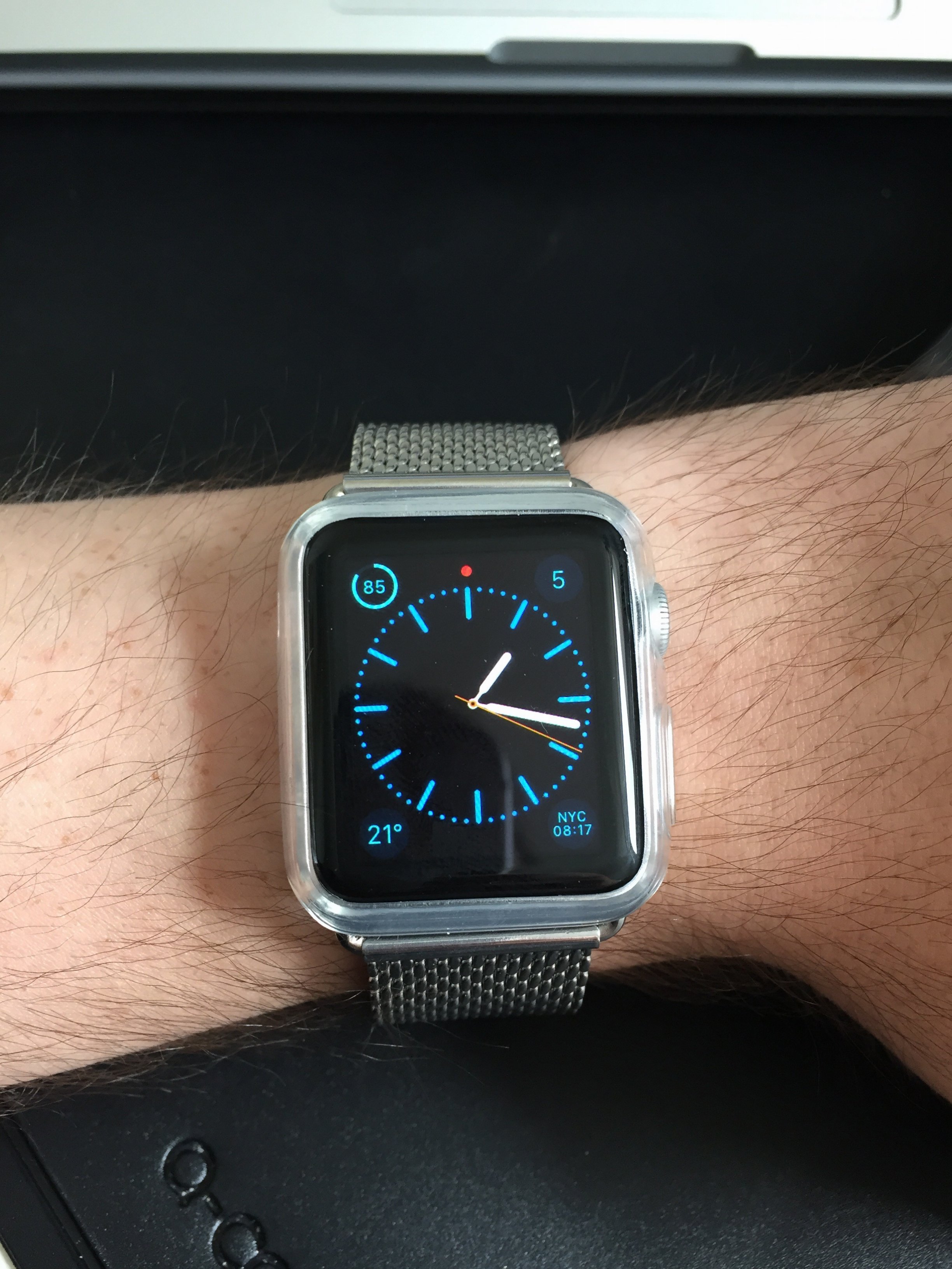 38mm sport with silicone protective case and 3rd party Milanese style band.
