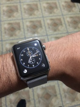 I hope he enjoys his watch and bands, but I have to agree - that watch appears to be entirely too big for his wrist, all the way around. He may prefer that, though. Does Apple offer different lengths for the Milanese, like they do the Leather Loop?If the ML magnet is coming all the way up to the watch case like it appears to be on those two pictures, I'd suggest that you need to go down to the 38mm watch size.