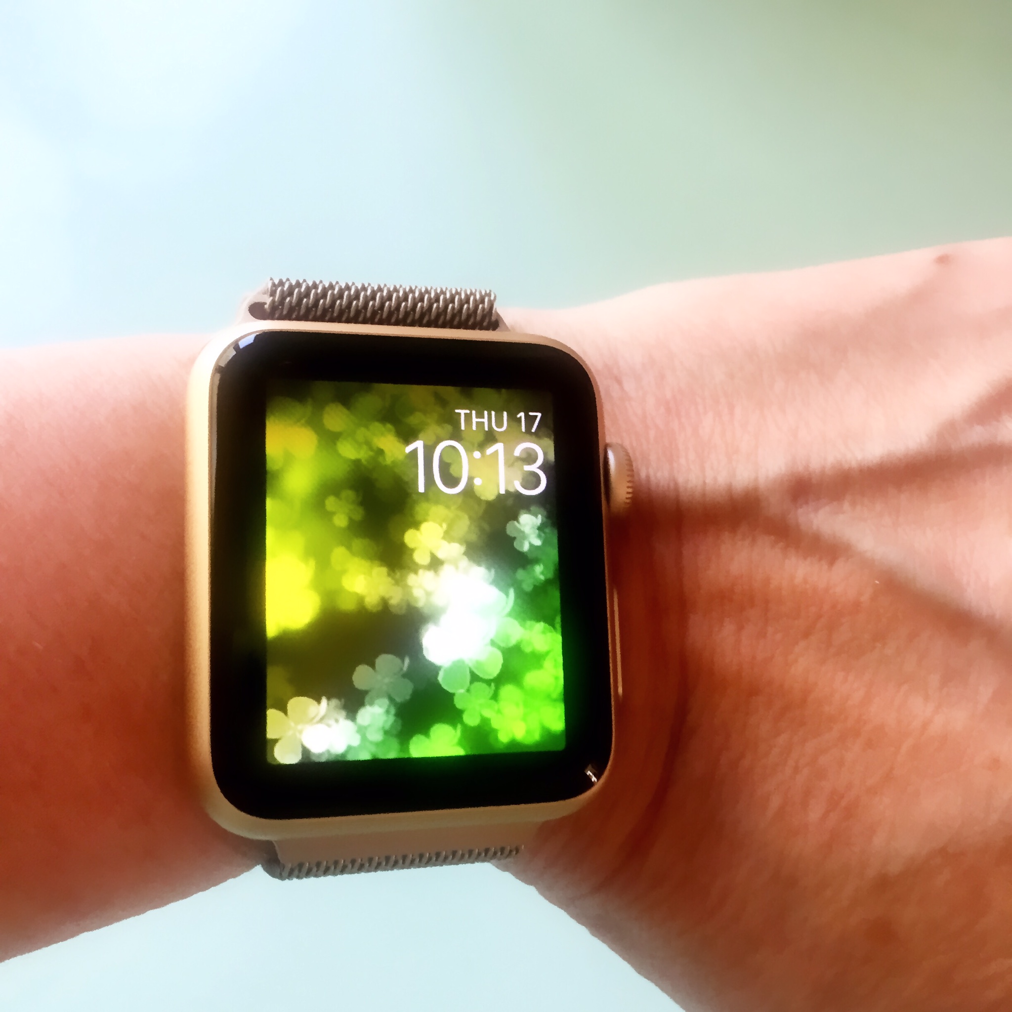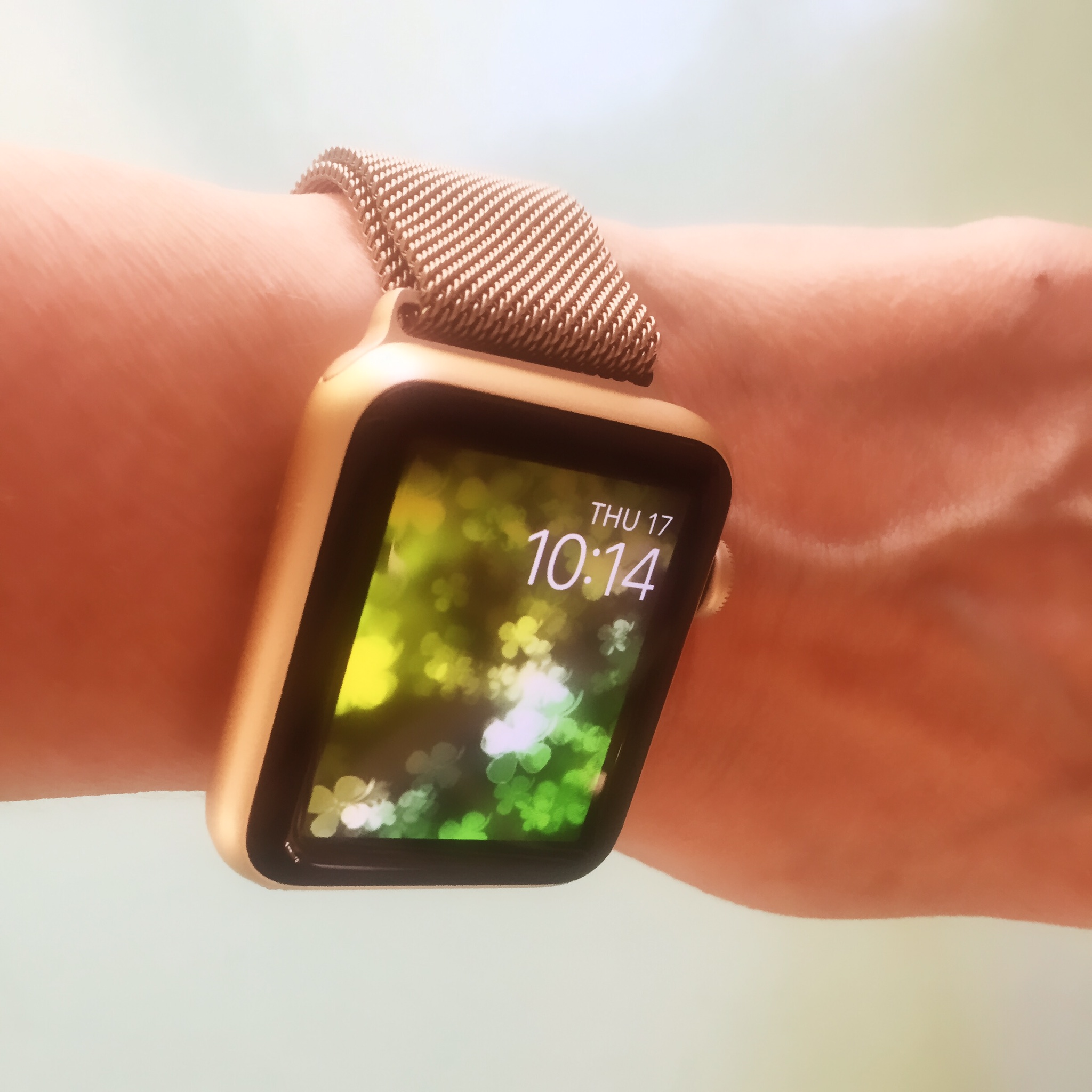 Is that a 3rd party band? I've never seen a gold Milanese Loop.My watch arrived yesterday evening. I have had a bit of time to figure stuff out, but have more to sort. I was nervous about going with 42mm. I am pretty sure this is what I prefer. My first thought is that it was smaller than I expected (even though I've seen in in real life). I don't think going to 38mm would make AW that much less of a statement. Either way, it's an AW and will be noticed. I had already bought a second band. It's easier to put on watch with this band vs the sports band it came with. I guess I need more practice. I am having slight issue with the watch slipping a bit with the gold band. I have to keep it quite tight. But I do love the gold band with gold watch. And of course I had to do the obligatory St. Paddy's Face.