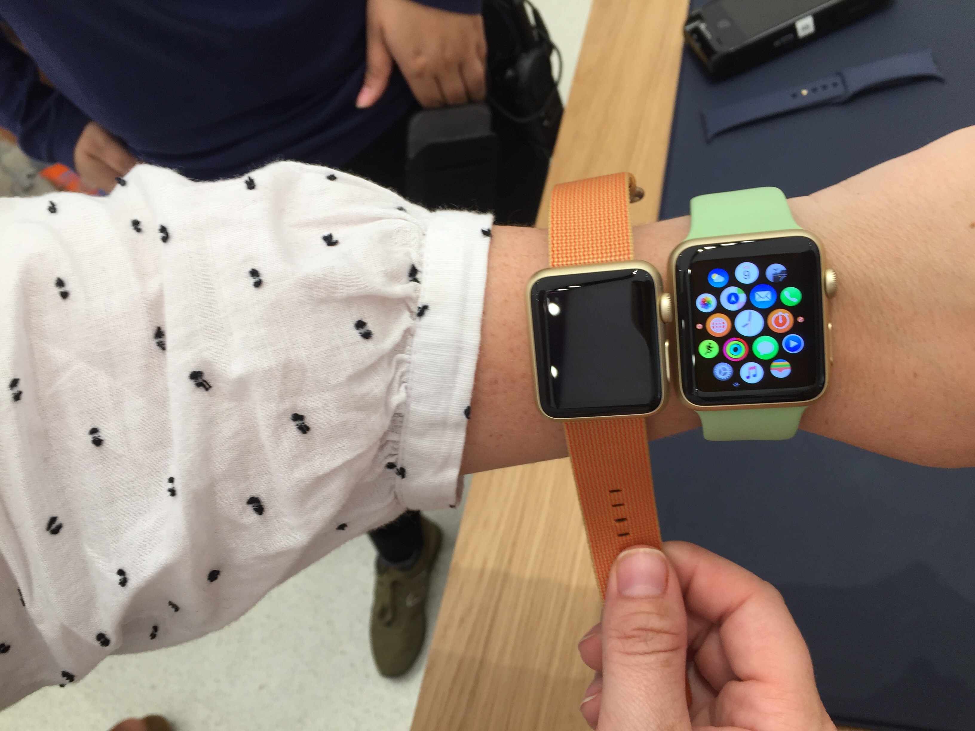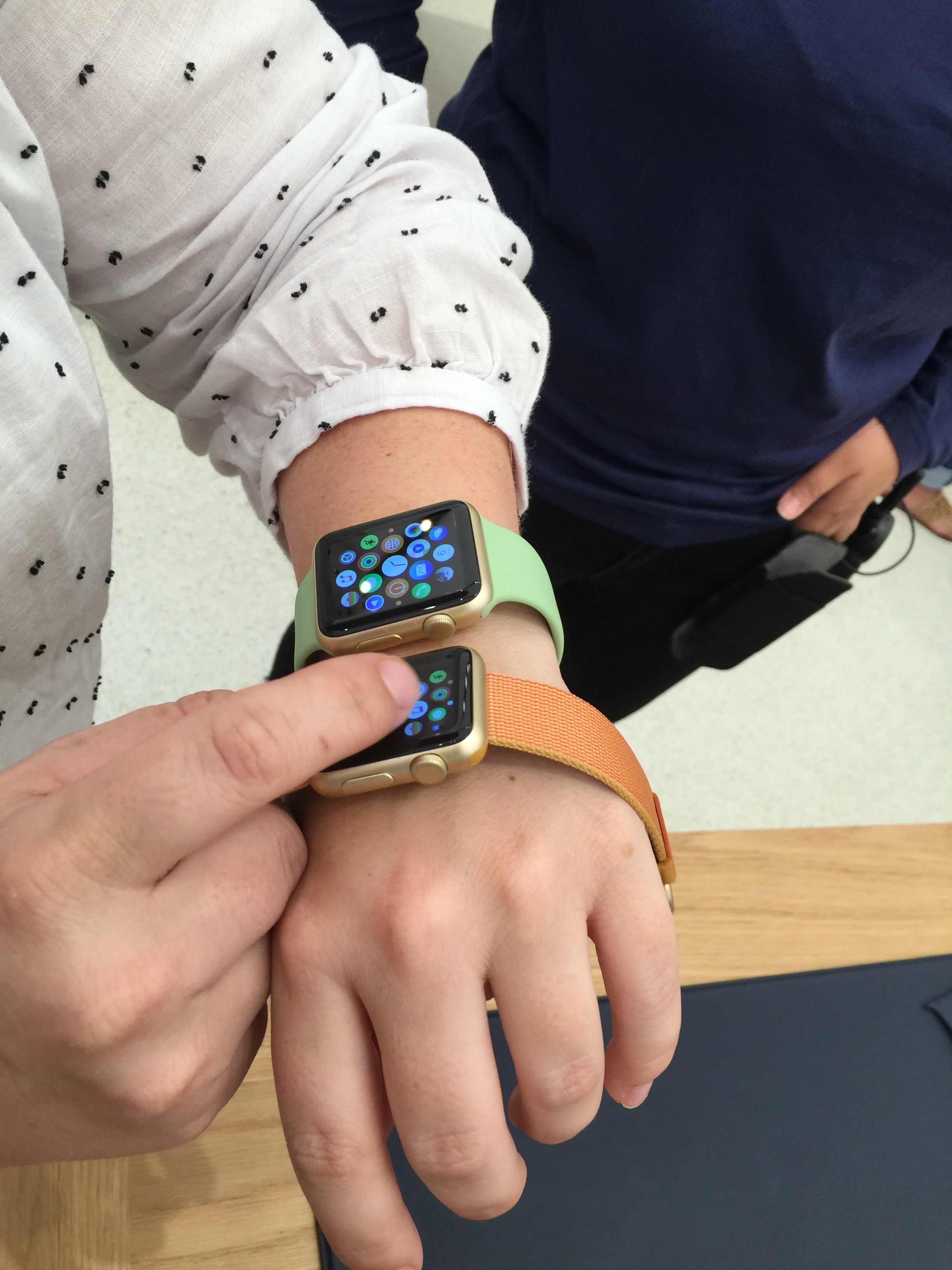38 looks better and so does the gold with white looking band.I went into Apple to try on both sizes before placing my preorder. I really wanted to love the 42 but I thought it was too big and clunky. The 38 felt right and looked more like a traditional watch, instead of a big tech gadget on my wrist. I think the modern buckle makes the 38 look larger and the sport band makes it look smaller.
