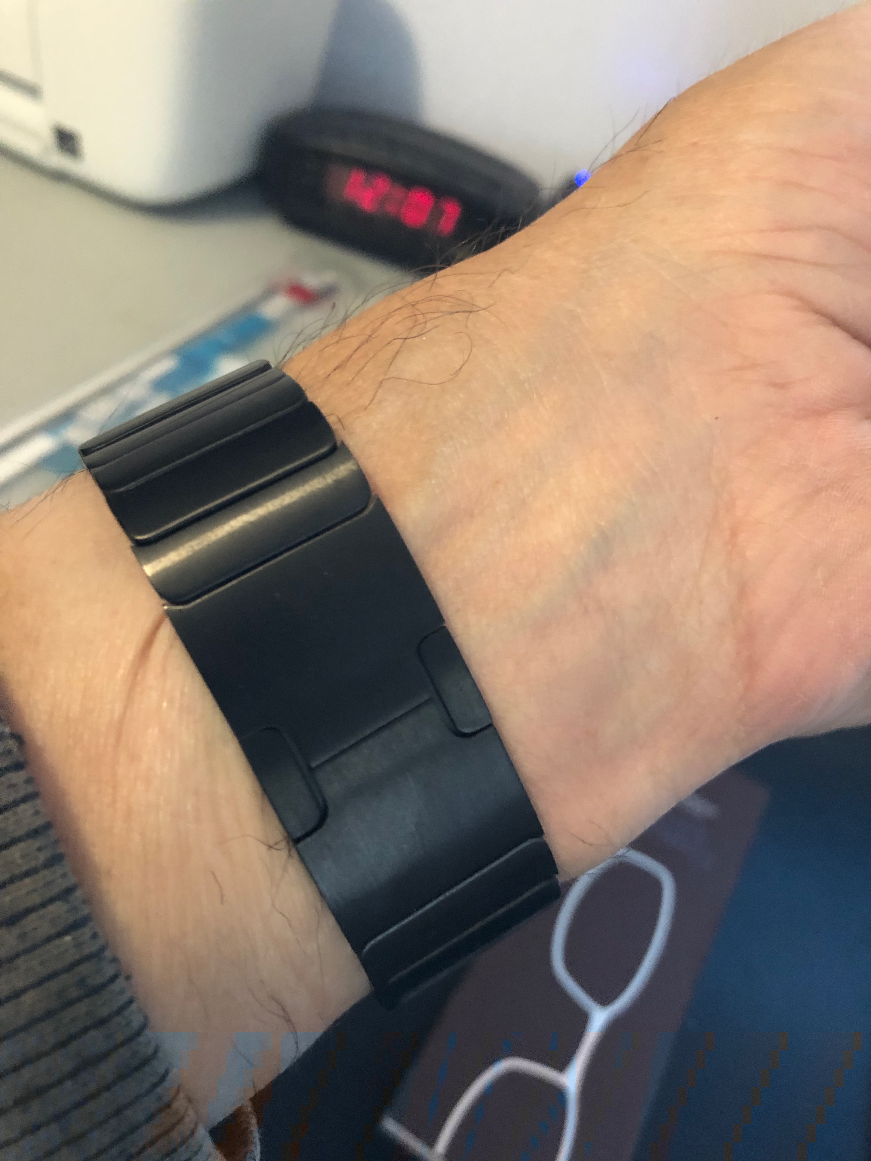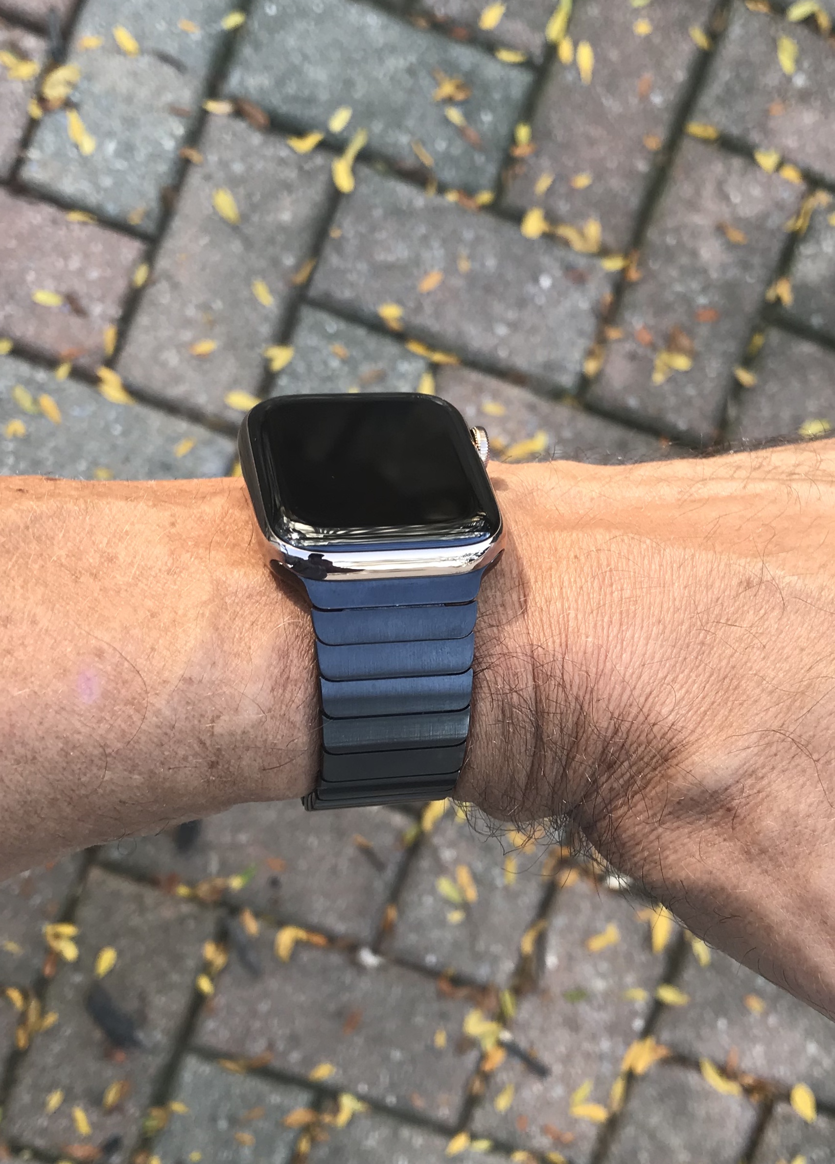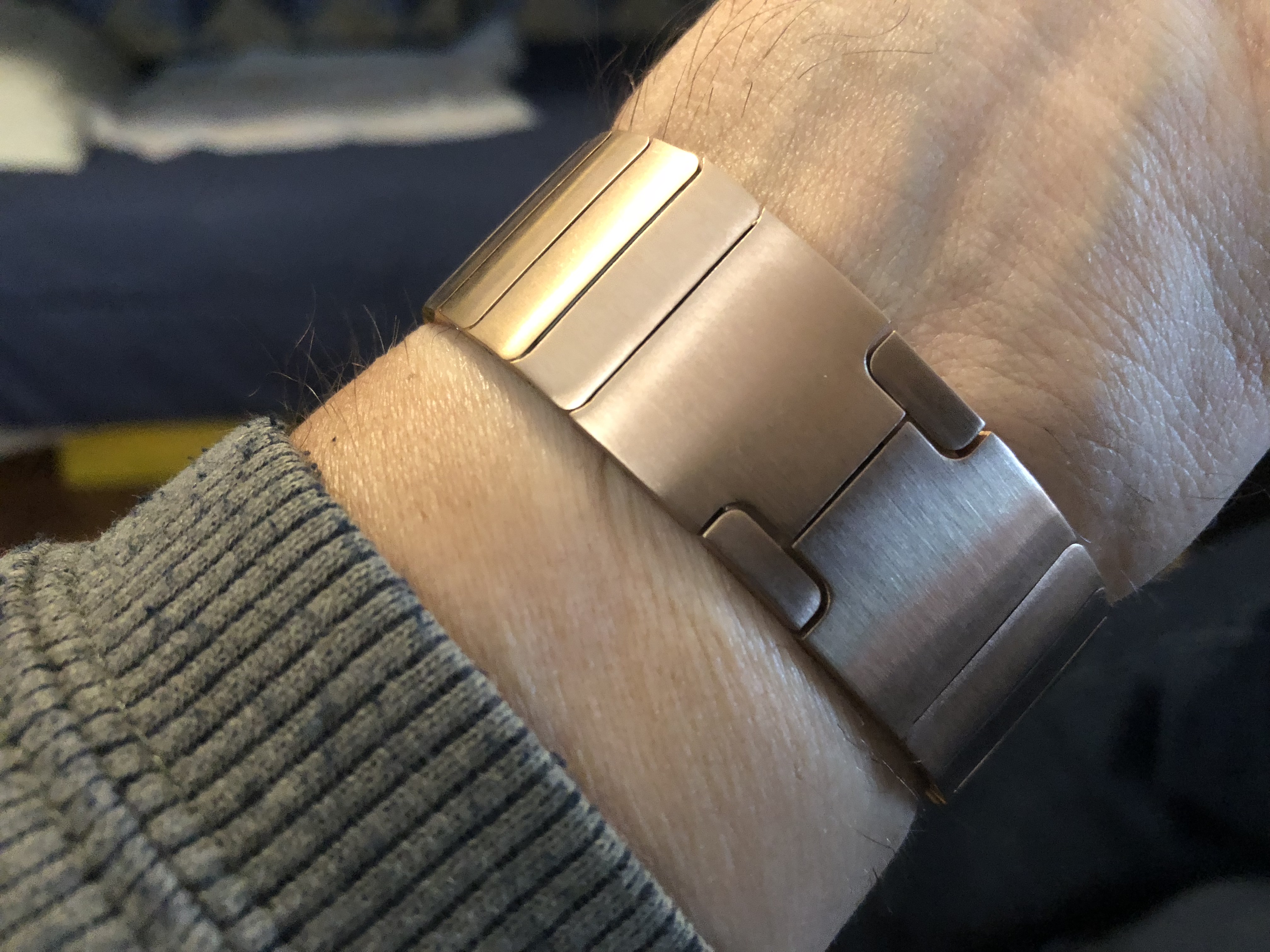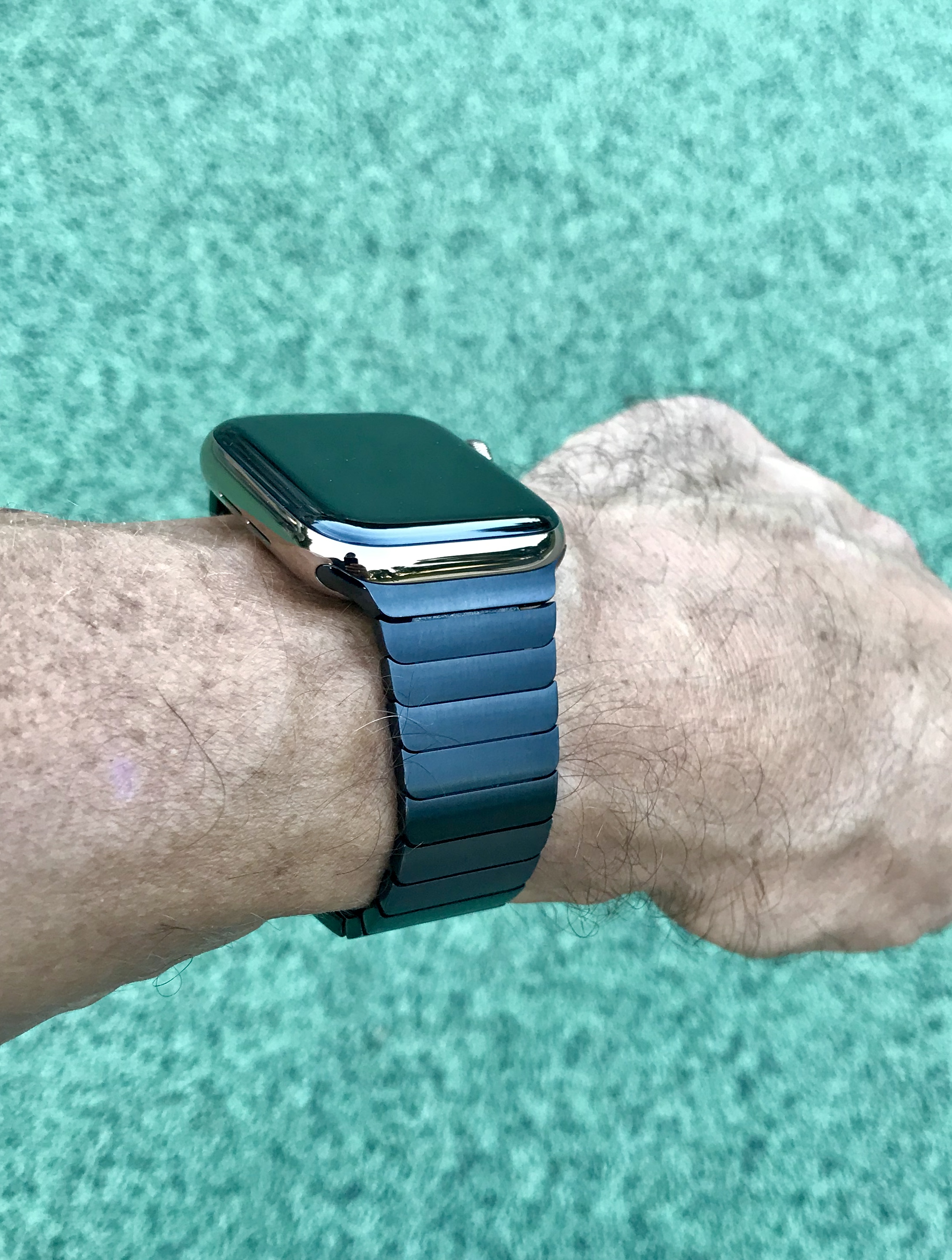 It very much picks up the environment it’s in. I think here it’s picking up the gray table. It inherently has some shadow to it between the links which also has a sort of halftone shading effect. But it might also need some kind of chemical bath since it’s three and a half years old, lol. I’m open to suggestions from the group on what to clean it with.