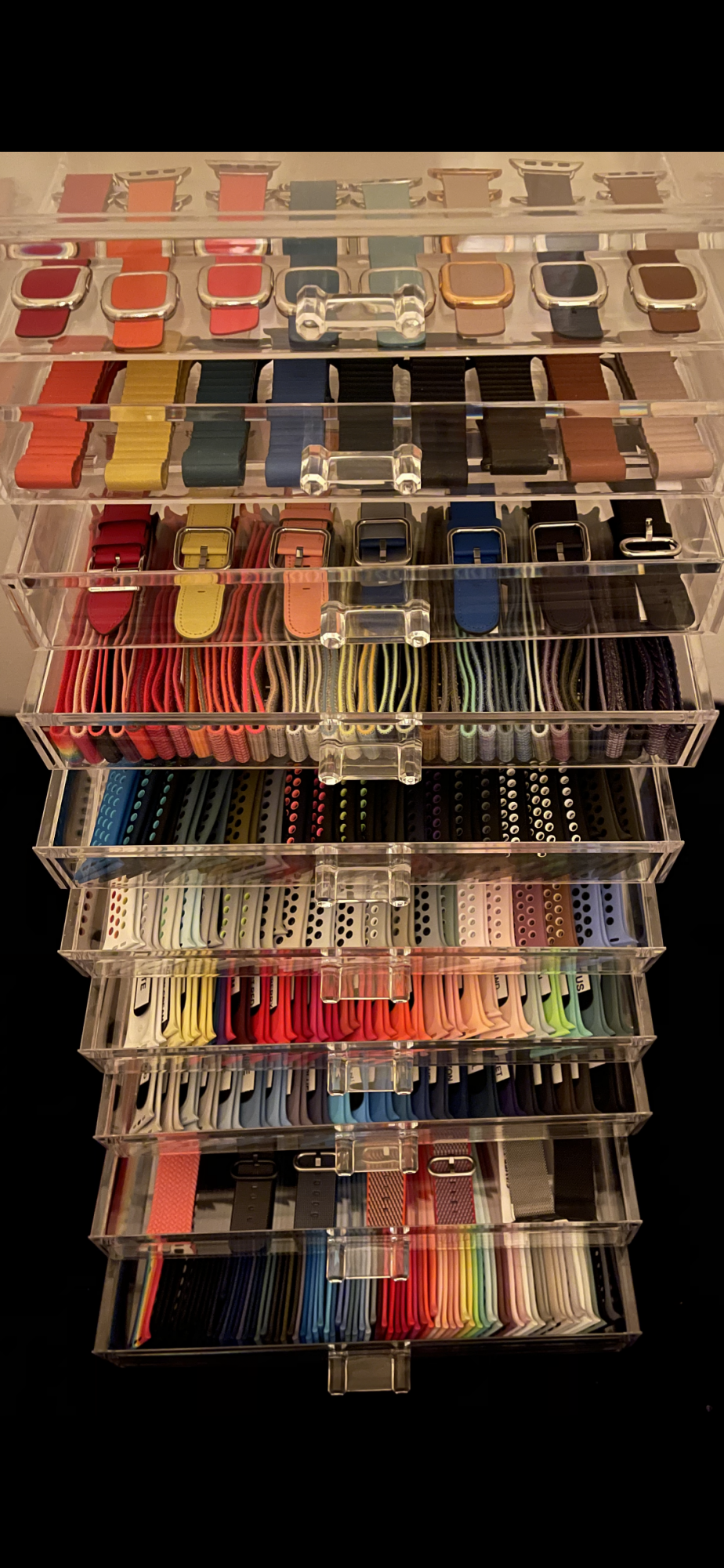 Bottom right: Black Gen 1, Blue Horizon, Midnight Blue Gen 2, Black Gen 2, Gray/Black Ceramic, Fog, White Gen 2, Hermes, Yellow Gen 1, Product Red Gen 3, Khaki sport