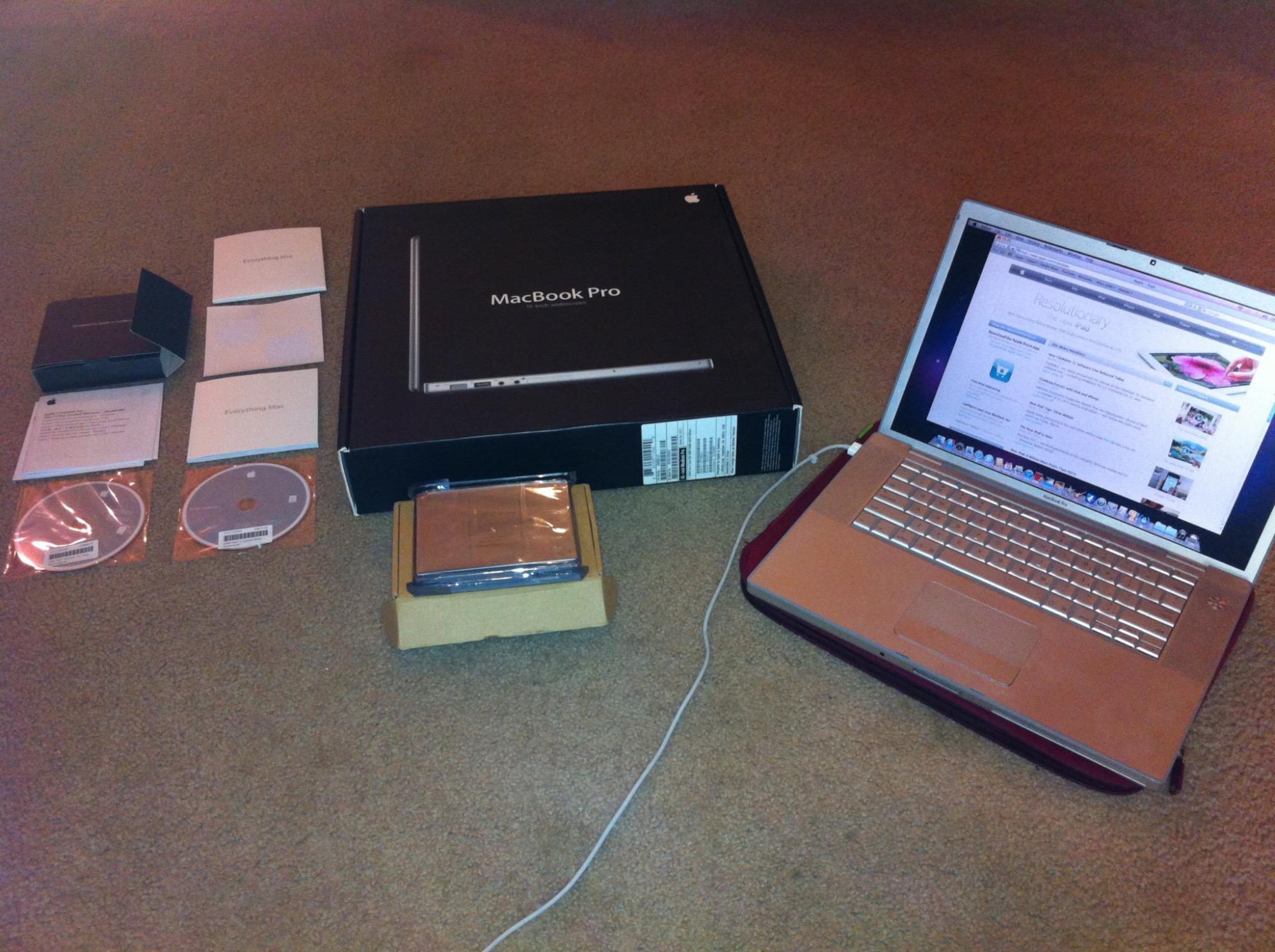 Been tinkering with a 1.83ghz core duo MacBook Pro I snagged for $59 shipped (first pic). So far I’ve installed snow leopard, picked up a brand new genuine battery, replaced the SuperDrive and installed arctic fox, tenfourfox, photoshop cs4 and a few other apps. I got a box for it as well but it’s for a 2.2ghz model. Still has Tiger pictured on the back so it’s close enough. Just wanted it for display anyway.