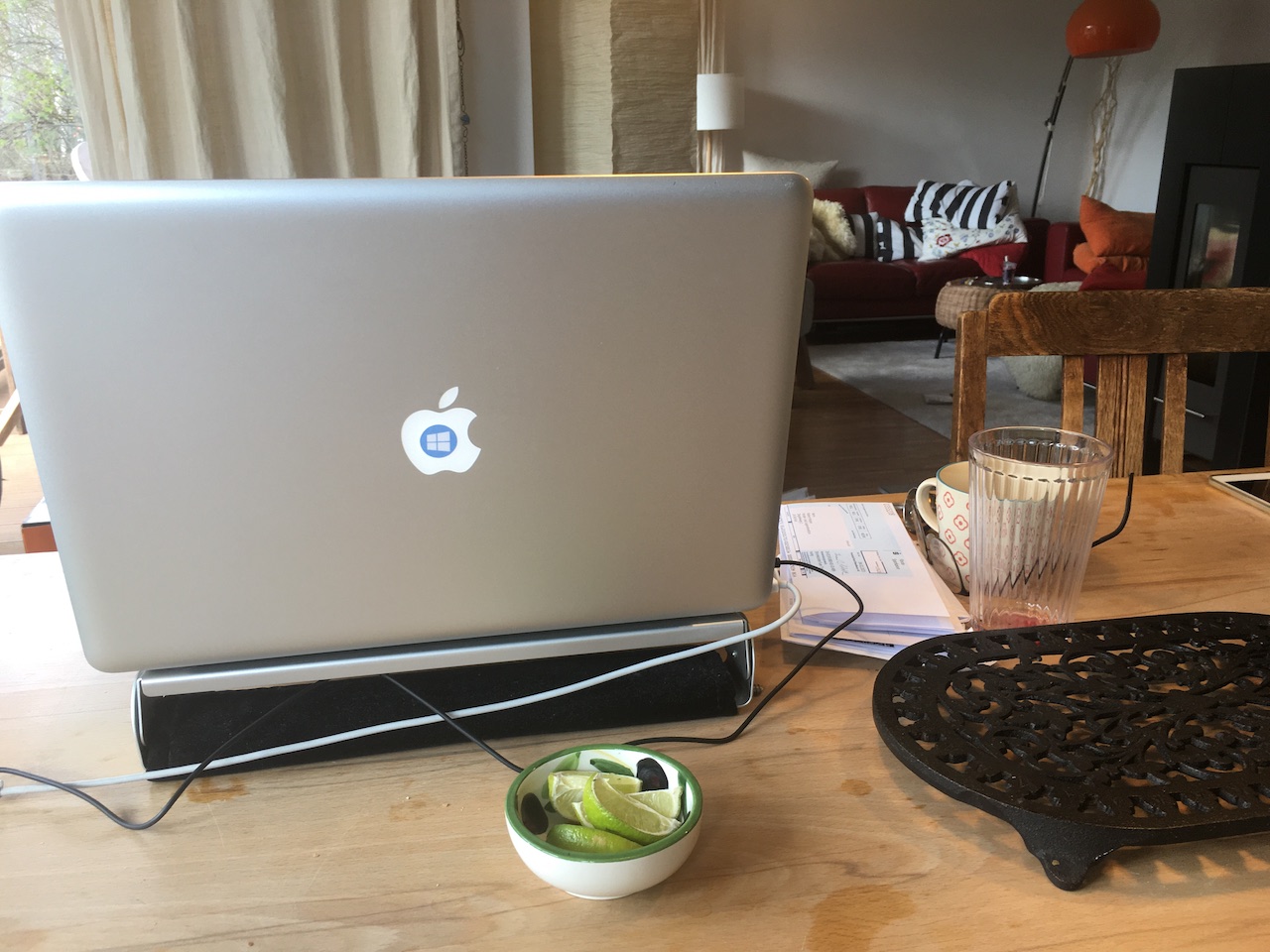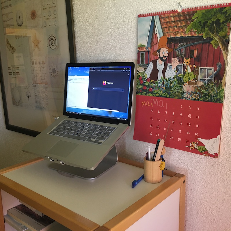 As a replacement for my "lost" desk I got a cheap full wooden 2,4m long, 60cm deep and 3,5cm strong countertop as a replacement (the discounter didn't offer the, my favourite, 1,8m long version any more) , that sits on the bookshelve on one side and two metal legs on the other side.