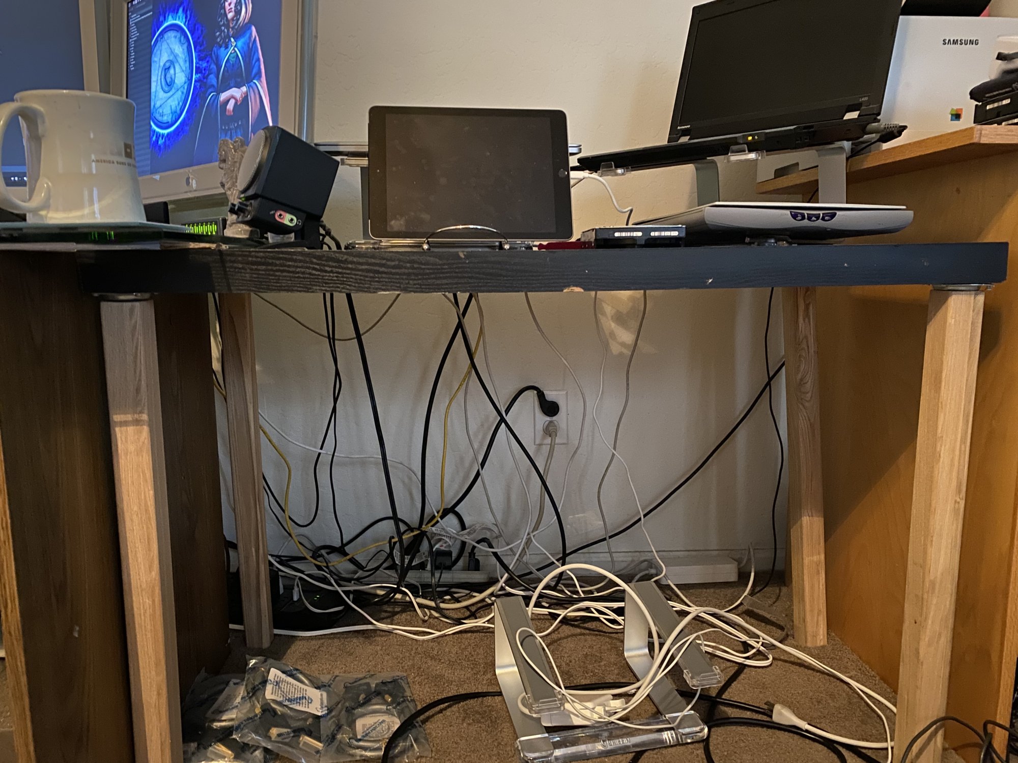 I agree, but doing that is sort of a permanent thing. My wife surrendered this part of the living room with the understanding that when the last kid moves out all the computer stuff goes into her room. If I mount a countertop, it may look nice, but I am eventually going to have to remove it.A Parsons coffee table does look nice.