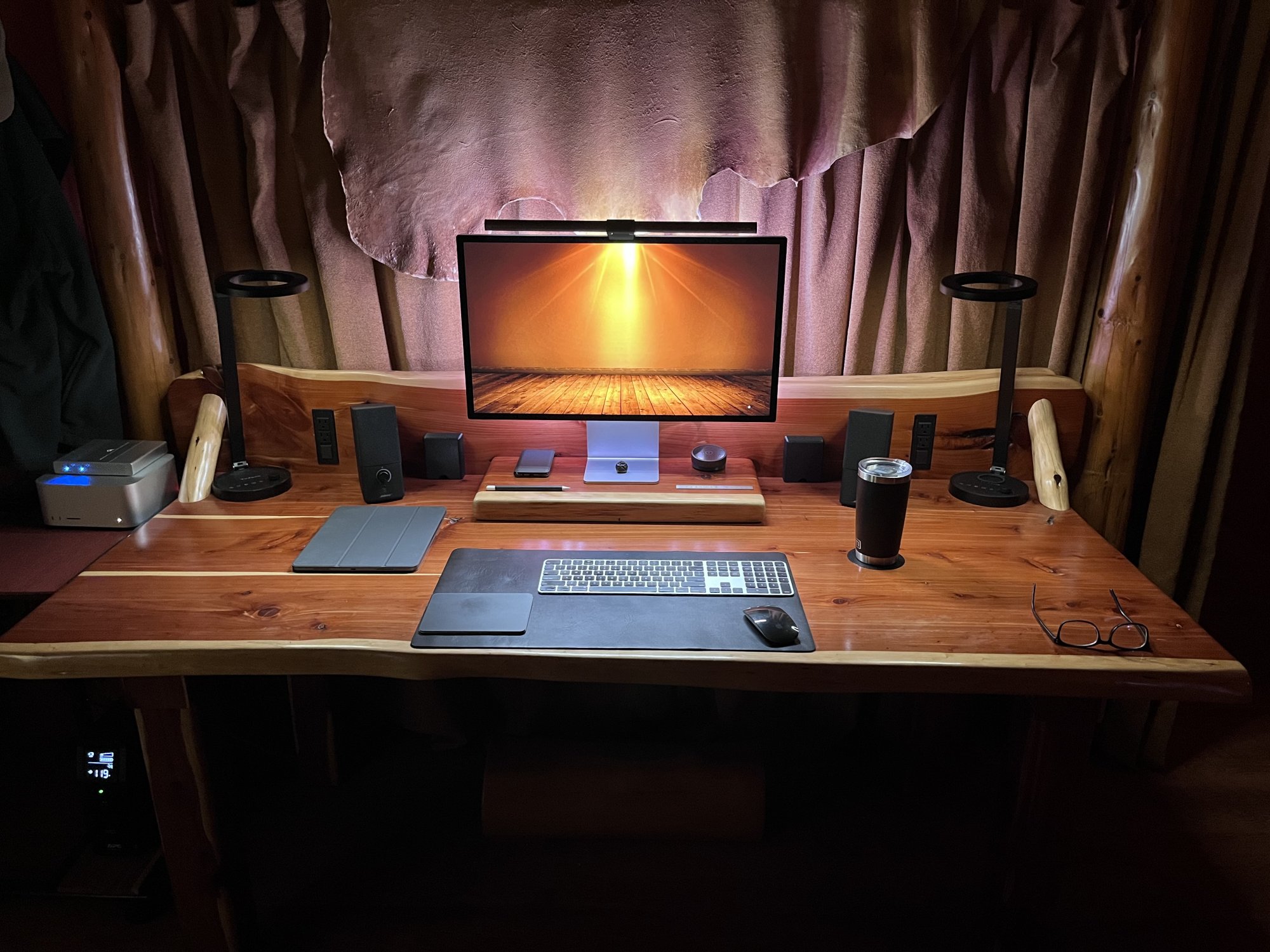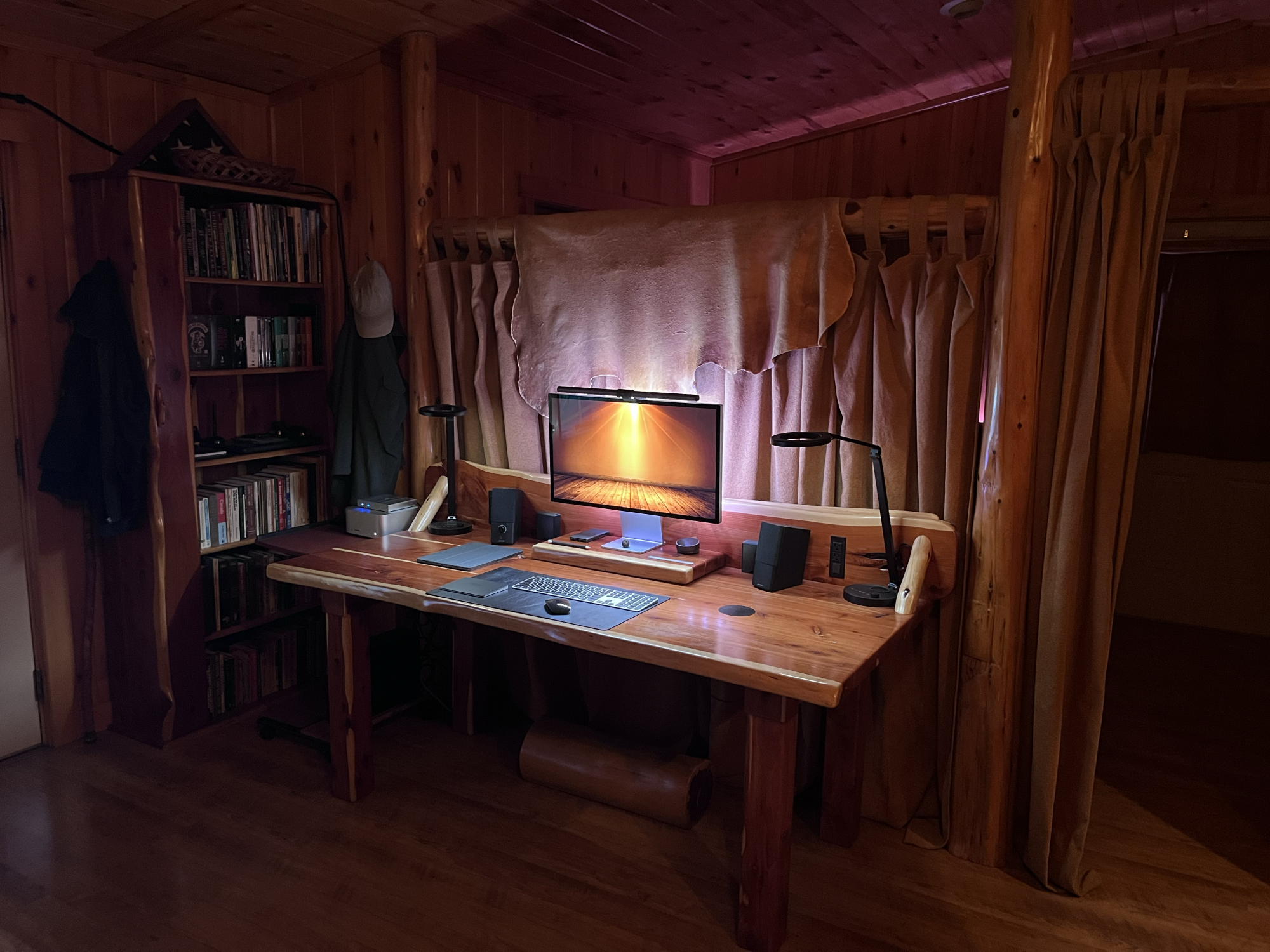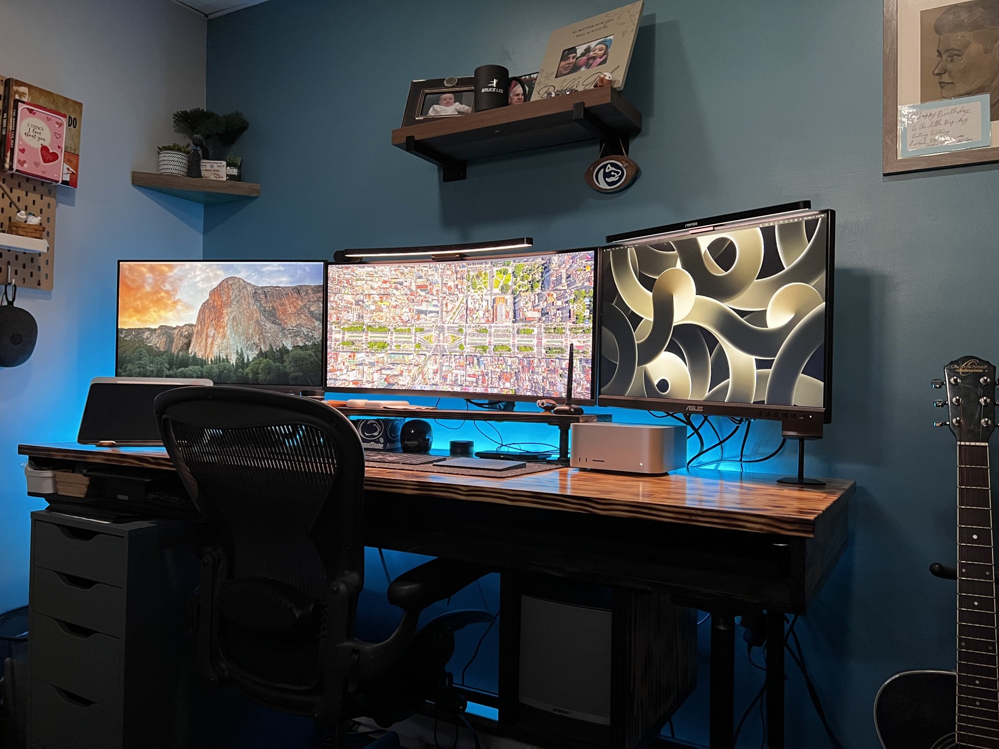 Mac Studio Ultra replaced an i9 Hackintosh tower that lived behind the right side monitor. That spot is now occupied by a much smaller OWC Thunderbay and my headphone hangar. The dedicated gaming PC that was behind the hackintosh is still behind the right monitor with a NAS on top. There's a little bit of a cable clutter below the side monitor that I'm not thrilled with, but it's better. USB-C dock for laptop, wired gaming mice, some cable extensions for the Studio and DP/USB switches for the two desktops require some cabling to be left somewhat loose and accessible.