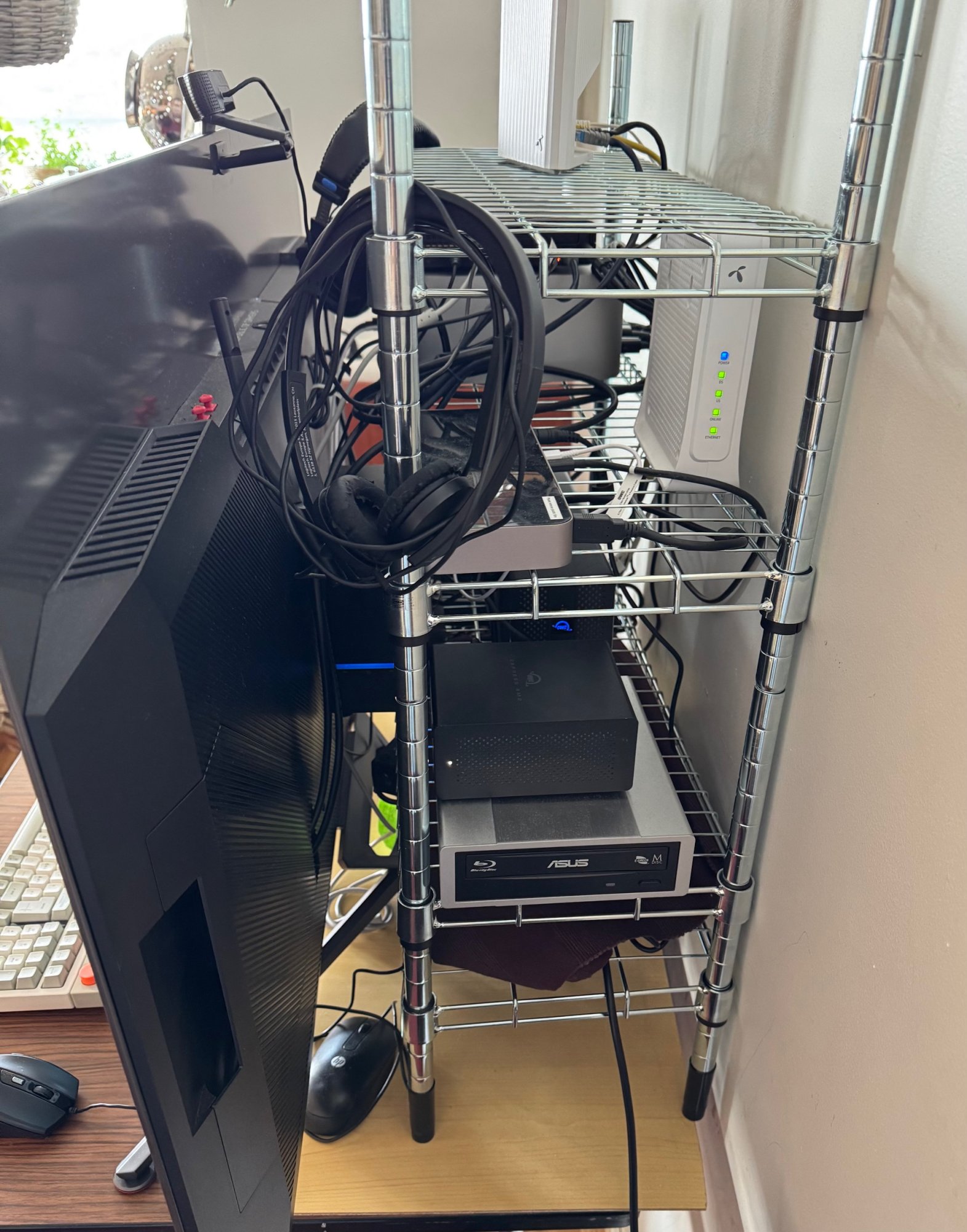 I stacked most of the equipment on an IKEA Omar rack. It keeps things compact and 12 cm above the table to reduce dust and be able to wipe under it.