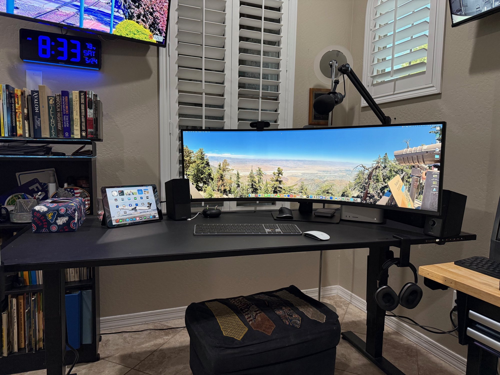 The main attraction of course is the M4Max Studio just behind the monitor's right half. As per advice from another member here I used a USB-C to DP cable and it worked great. The monitor defaulted to 5120x1440 at 240Hz.