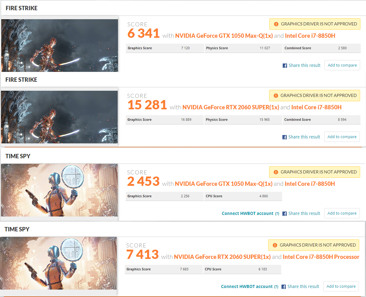 Lenovo Thinkpad X1E (gen 1), Razer Core X chroma (with a RTX 2060 Super) and a LG ultrawide. Overall I was surprised at how fast the thinkpad's 1050-ti was - my expectations were rock bottom I guess, but the Razer Core X with the RTX Super blows the doors off