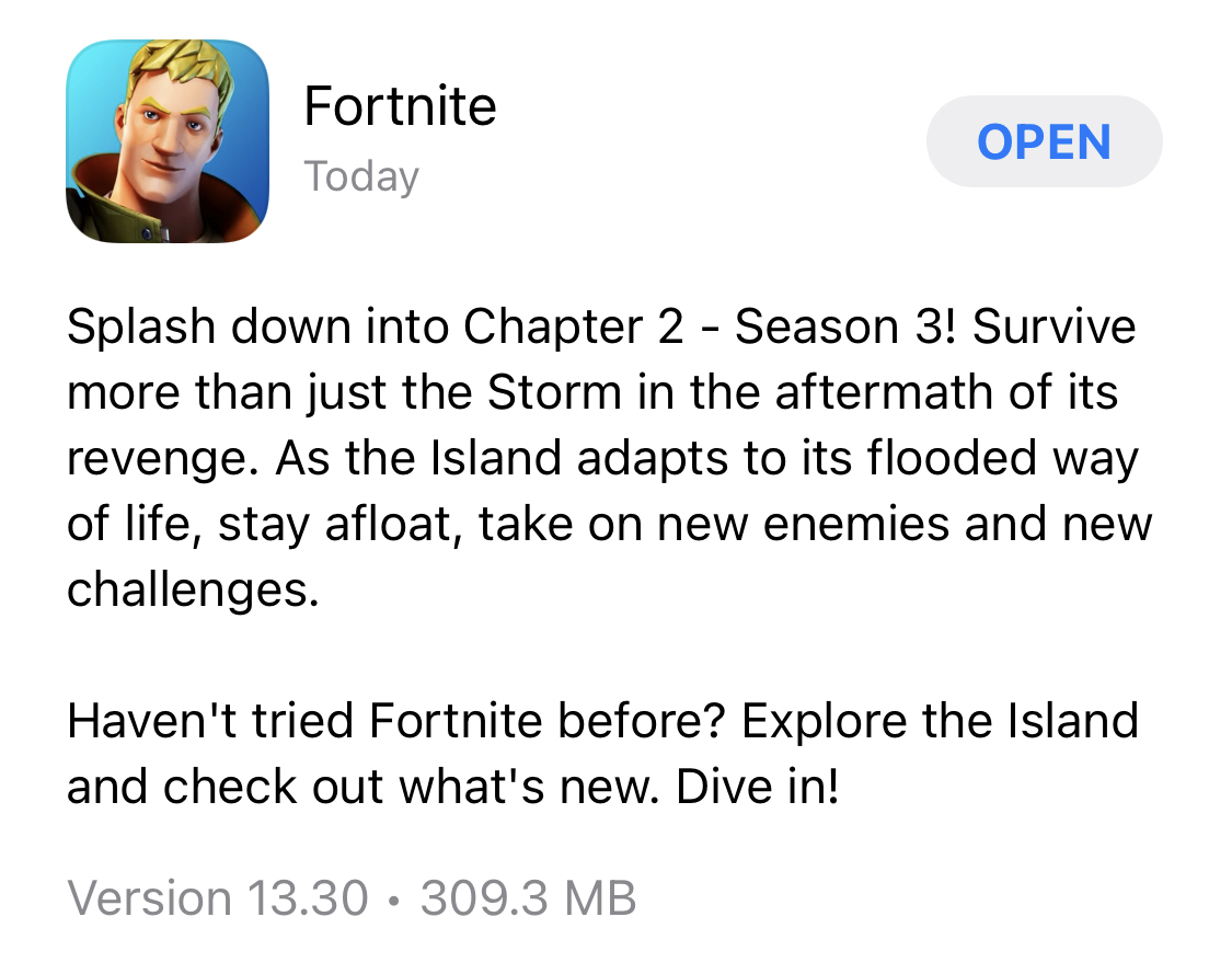 Fornite skipped adding Sign In With Apple in this update, even though it’s a bunch of major feature updates, not just for bugs.