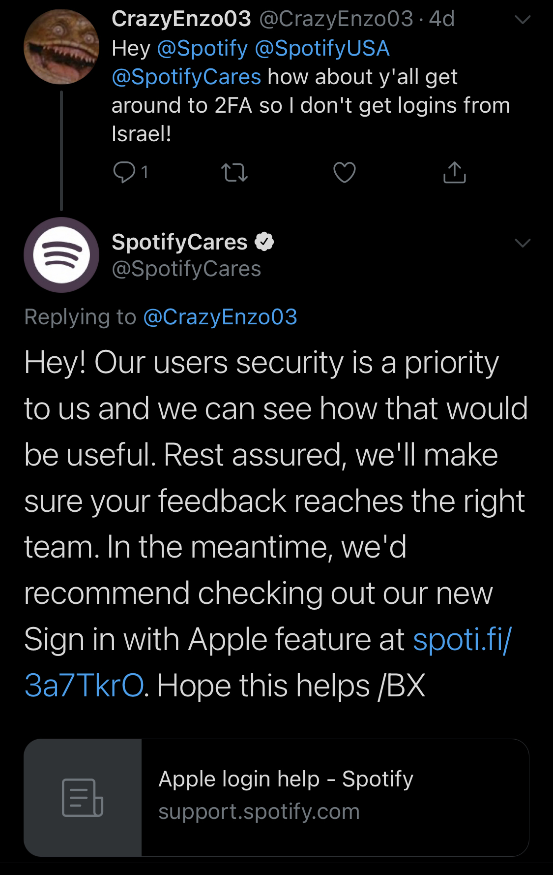 Developers who refused to add SIWA because of “customer support” issue CAN’T RELATE.Spotify didn’t just add Sign In With Apple reluctantly. They’re actively encouraging their customers to use it for its 2FA security.