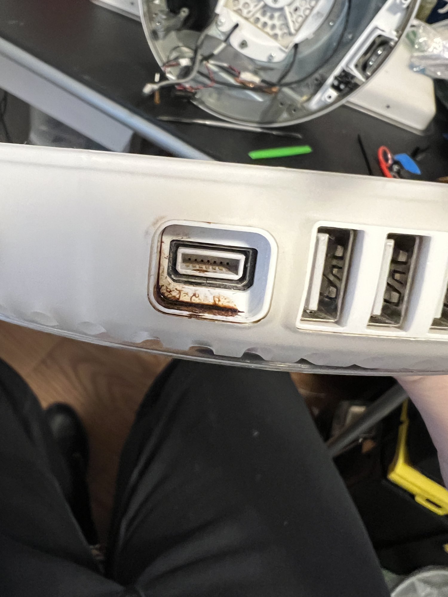 It was in rough shape, something sticky leaked inside on the board and out one of the ports. The screen bezel was coming off from the back, and it was so dirty that I joked it must have been used in a dust museum.