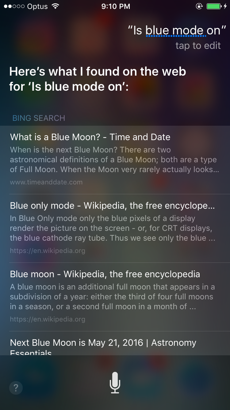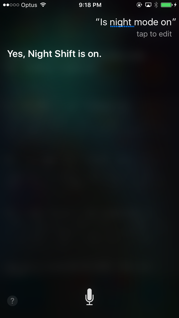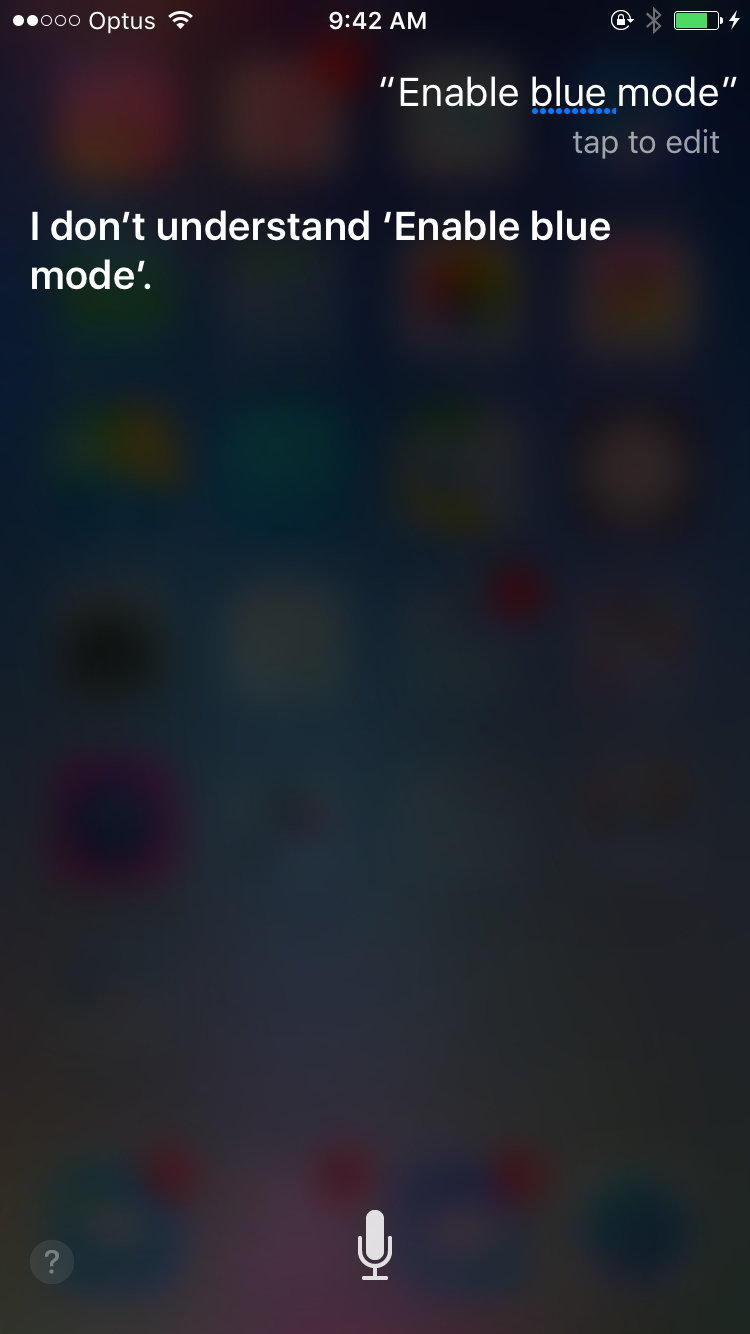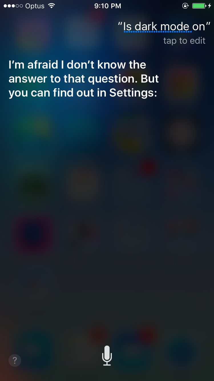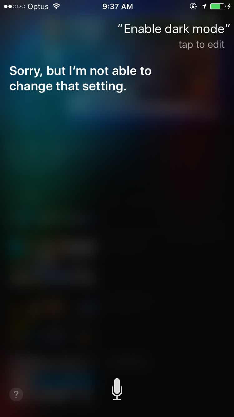 With all the rumours going around about a 'Dark Mode' in iOS 10; I thought I'd see if Siri knows anything about the 'Dark Mode' in iOS 10. So I asked here to 'Enable Dark Mode' and she said 'Sorry I can't change that setting' - she seems to have successfully recognised it as a setting!