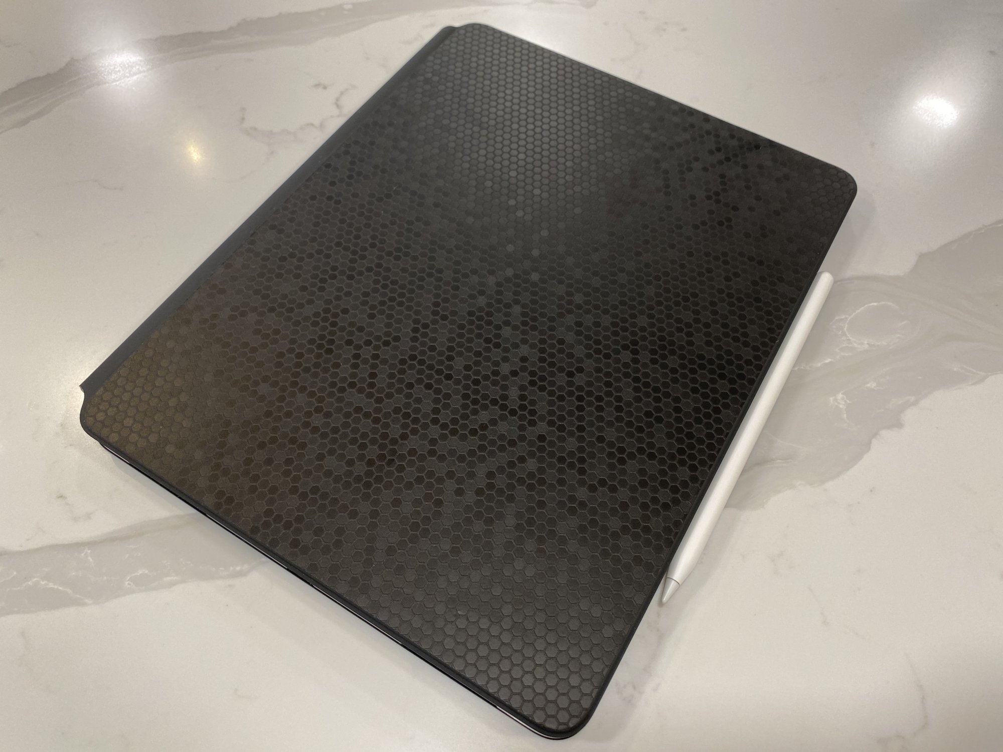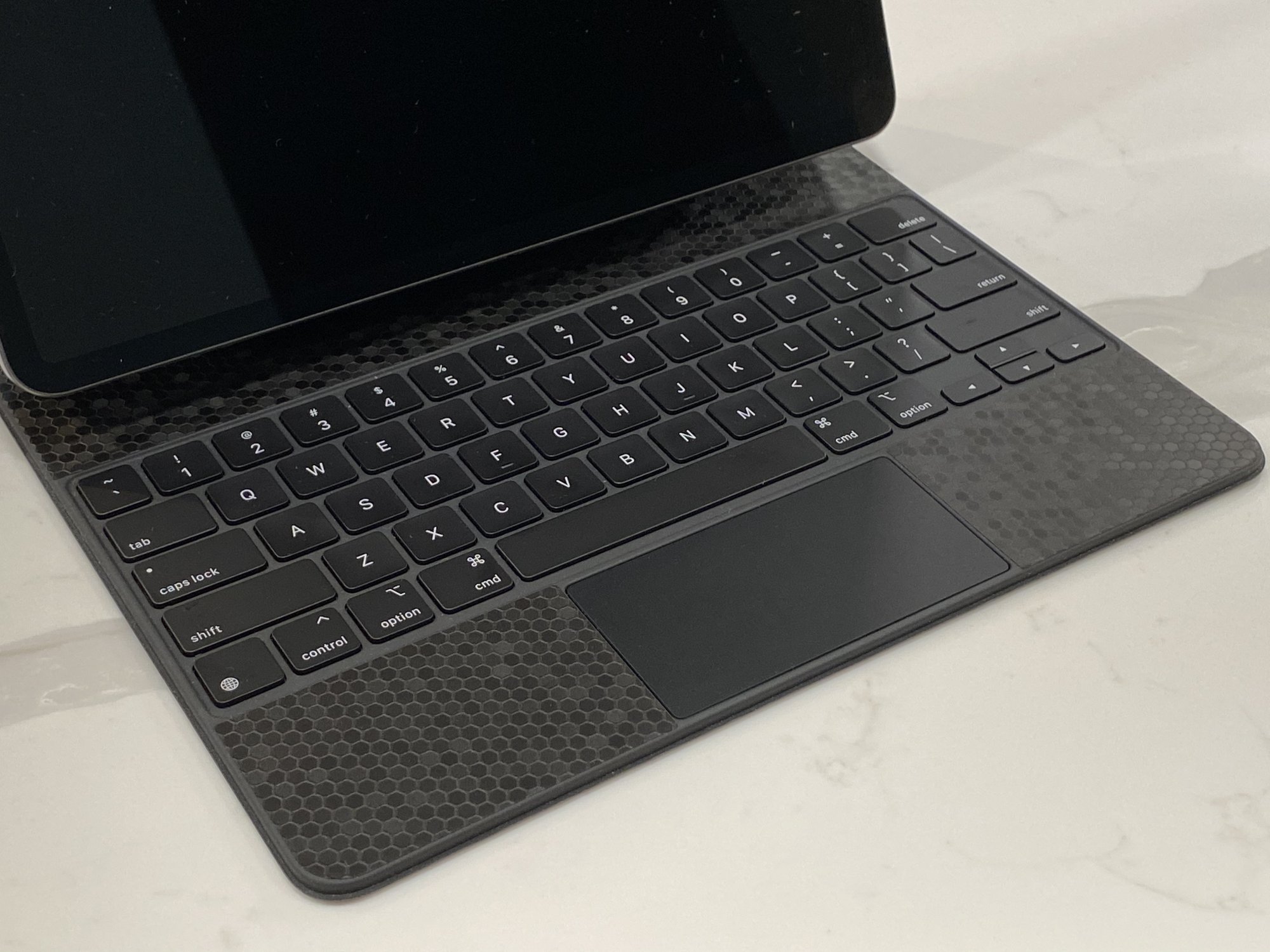 Here are some pics of my gunmetal carbon sophiguard skin. Installation was a breeze; I did use a hair dryer on the edges for piece of mind but not sure it was really needed. Decided not to install the trackpad skin as I like the smooth glass feel.
