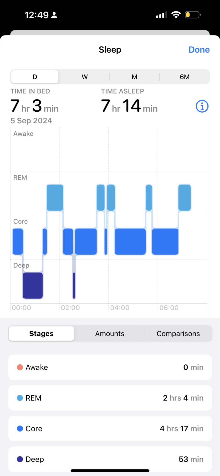 I'm using an Apple Watch 9 with watchOS 11, and I noticed an inconsistency in my sleep tracking data. The app shows I was asleep for 7 hours and 14 minutes, but I was only in bed for 7 hours and 3 minutes. Has anyone else experienced this issue or have any insights?