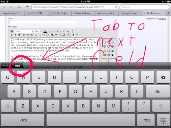 There are already buttons to *tab* between fields using safari.Although I can see the argument for not using tabs in word processing, and I can kind of agree with that, I would still expect a tab key. My reasoning? Well when typing an email, or filling in a form online it can be quite a pain to keep repositioning my hands from typing mode, to having to touch somewhere on the screen to go to the next field.