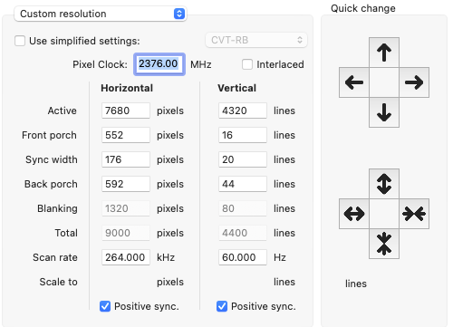 In the SwitchResX menu bar menu, both millions and billions of colors show up, as well as a HDR options. Maybe I can’t get MacOS to turn into 4:2:0 chroma sub sampling (which seams to be required to get 8K).