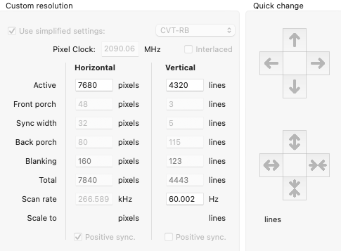 Yes, create CVT-RB timings for 8K30 and 8K60. They will have pixel clock of ≈ 1030MHz and 2090MHz. The first may be useful for DisplayPort since it doesn't require DSC for RGB 8bpc. The second doesn't require DSC for 4:2:0 8bpc (not sure if I've every seen DisplayPort output 4:2:0 on a Mac - it requires DisplayPort 1.4 which some Macs support).