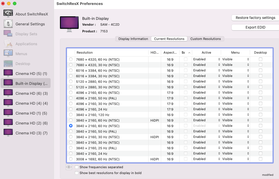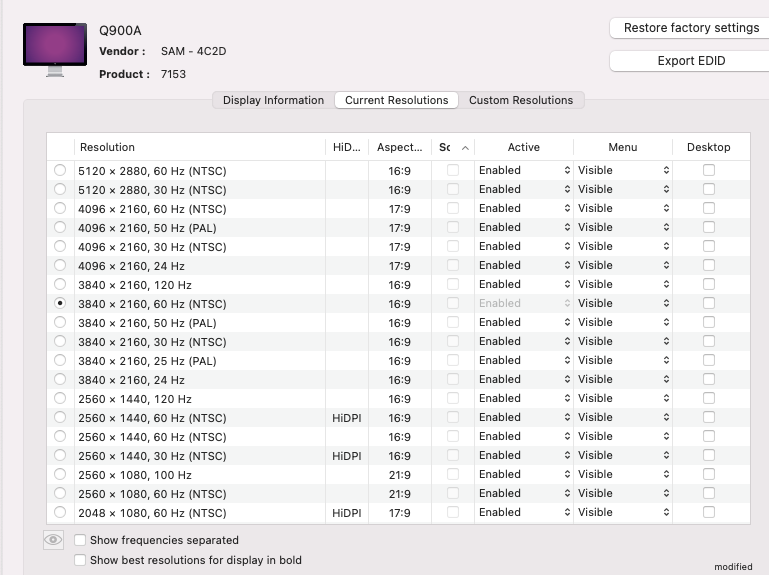 An issue is that changing the settings of the TV may change the EDID including the product number. For example, previously you posted EDID's that had product ID 0x7154 but these new ones have product ID 0x7153. The dates in the EDIDs are the same, so SwitchResX will use the same override file for both. I want to check the EDID in the override file to see which version it matches (so far I have four different versions from you - one pair for each product ID where each pair has a version that is modified by the VMM6100).