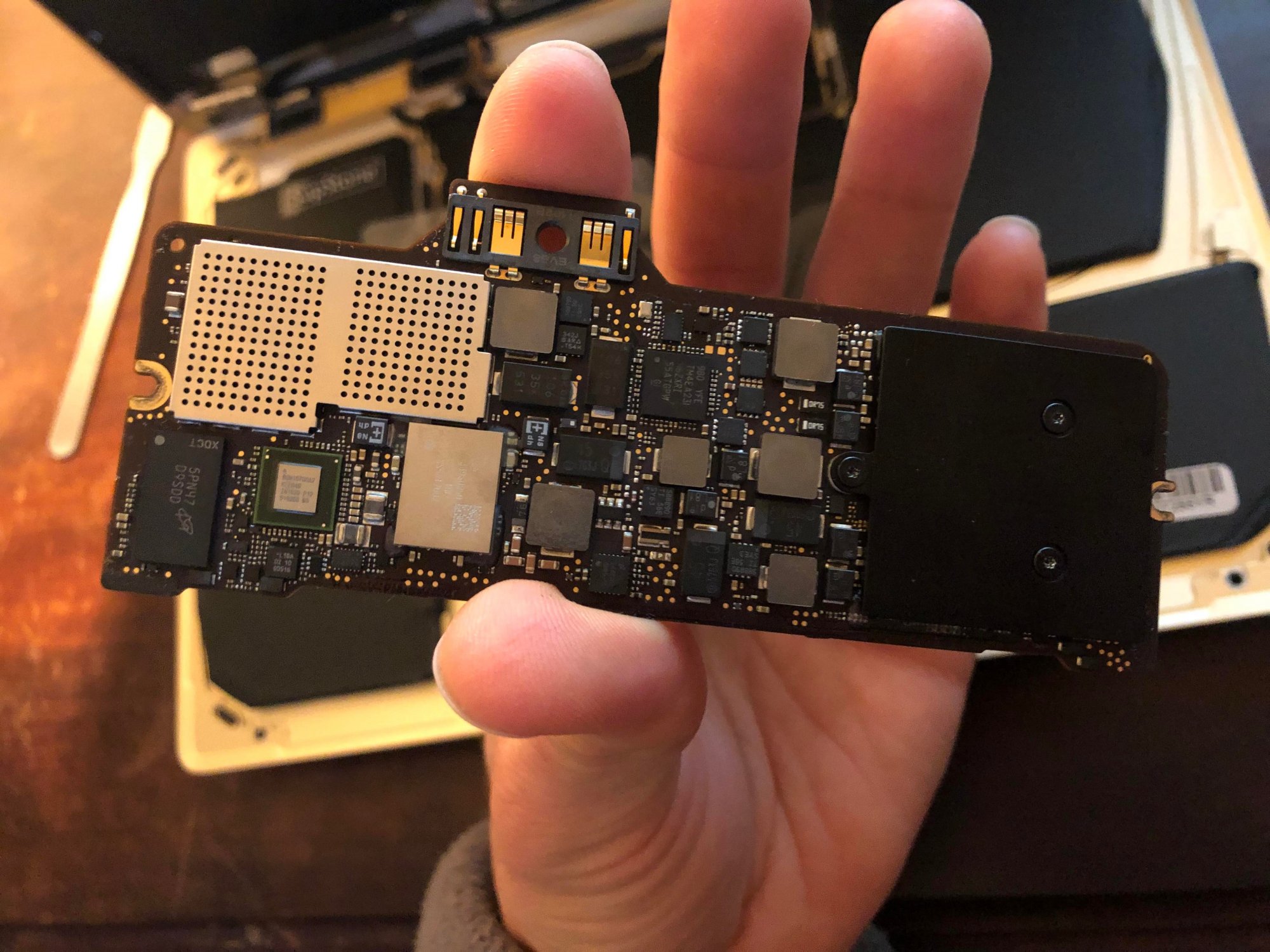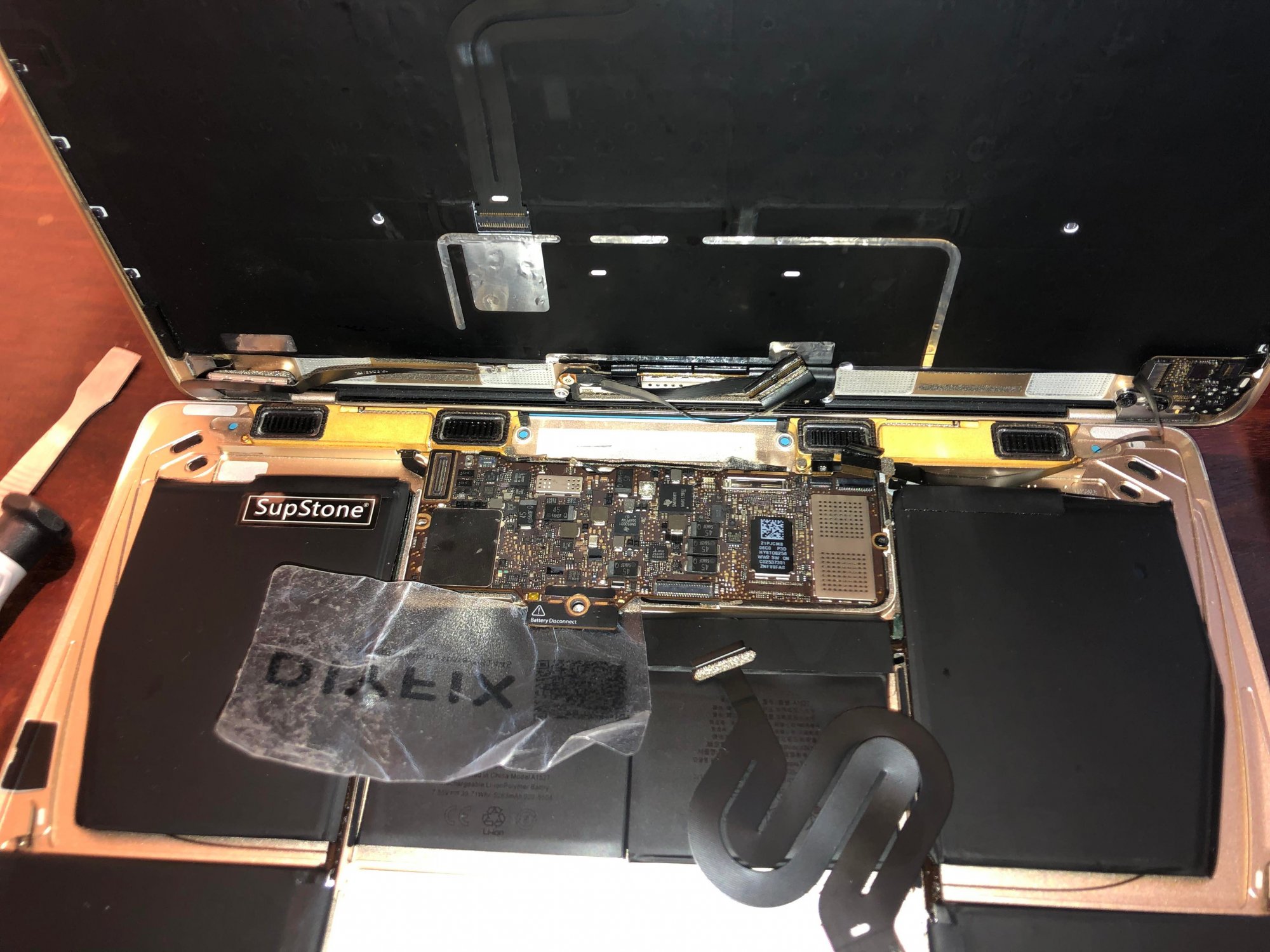 Here's the MacBook open with a plastic card to disconnect the battery. The button to power it off, next to the battery connector didn't work for me.