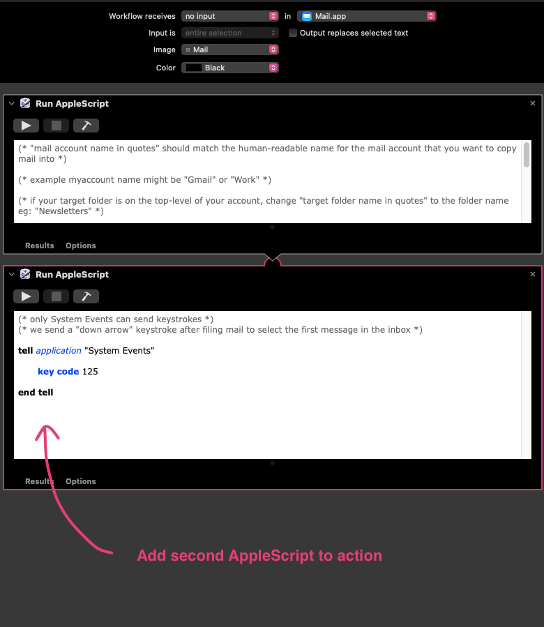 A few of us were chatting in this thread about Apple dropping support for plugins in Mail for macOS Sonoma. We have a possible solution for folks who were using Mail Act-On to assign keyboard shortcuts to move messages into designated folders. It uses a combination of Automator, Applescript, and Keyboard Shortcuts.