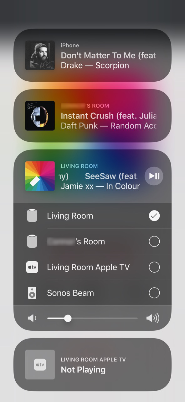 AirPlay 2 devices like HomePod and Apple TV appear as a dedicated 'card' (Apple's wording) in Control Centre: