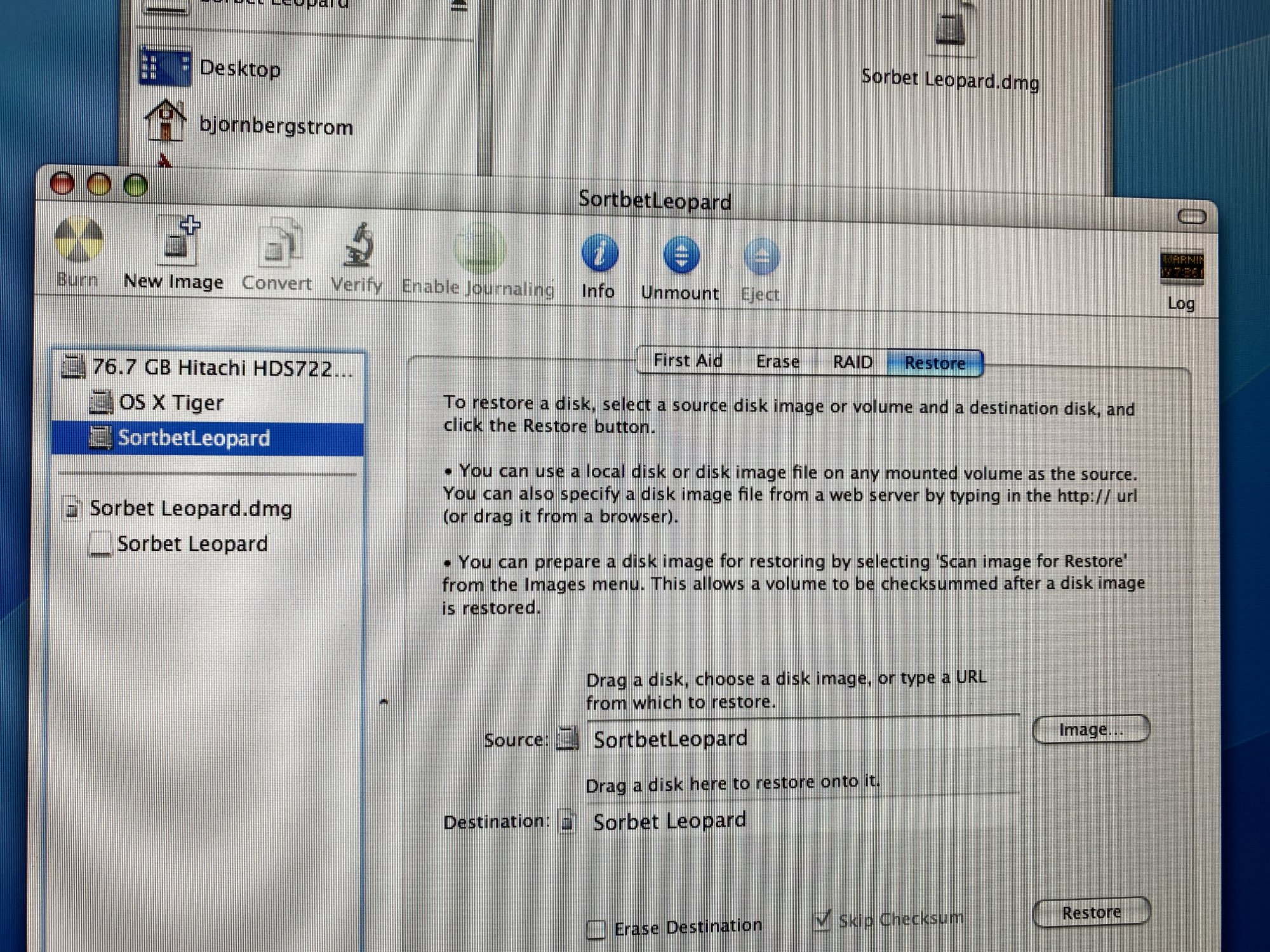 I ended up copying the DMG file in a USB drive, booting the leopard installation DVD and restoring the DMG using the installation disk manager app. So far so good!Anyone has tried to use it on an iBook G4 with a 30Gb HDD? I would like to use it and remove the other OSX installation (Tiger currently) but not sure how to do it because the HDD is so small.. I cannot create a 20 Gb partition because the OS + sorbet leopard DMG makes the remaining space less than 20 Gb 😅
