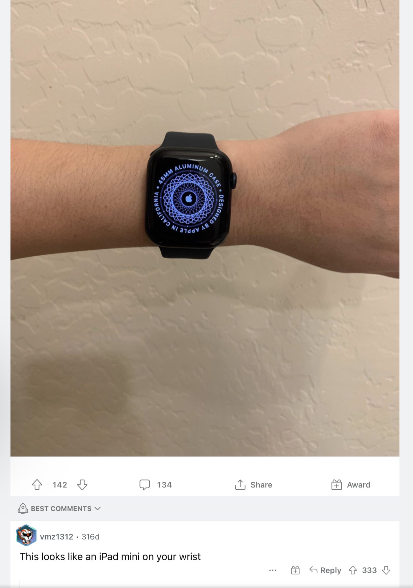 Im not alone in this thought either, below is a picture of someone with a 45mm apple Watch and the top comment is “looks like you have an iPad mini on your wrist” which is a perfect description, and the new ultra is 4mm bigger ! 😆😆