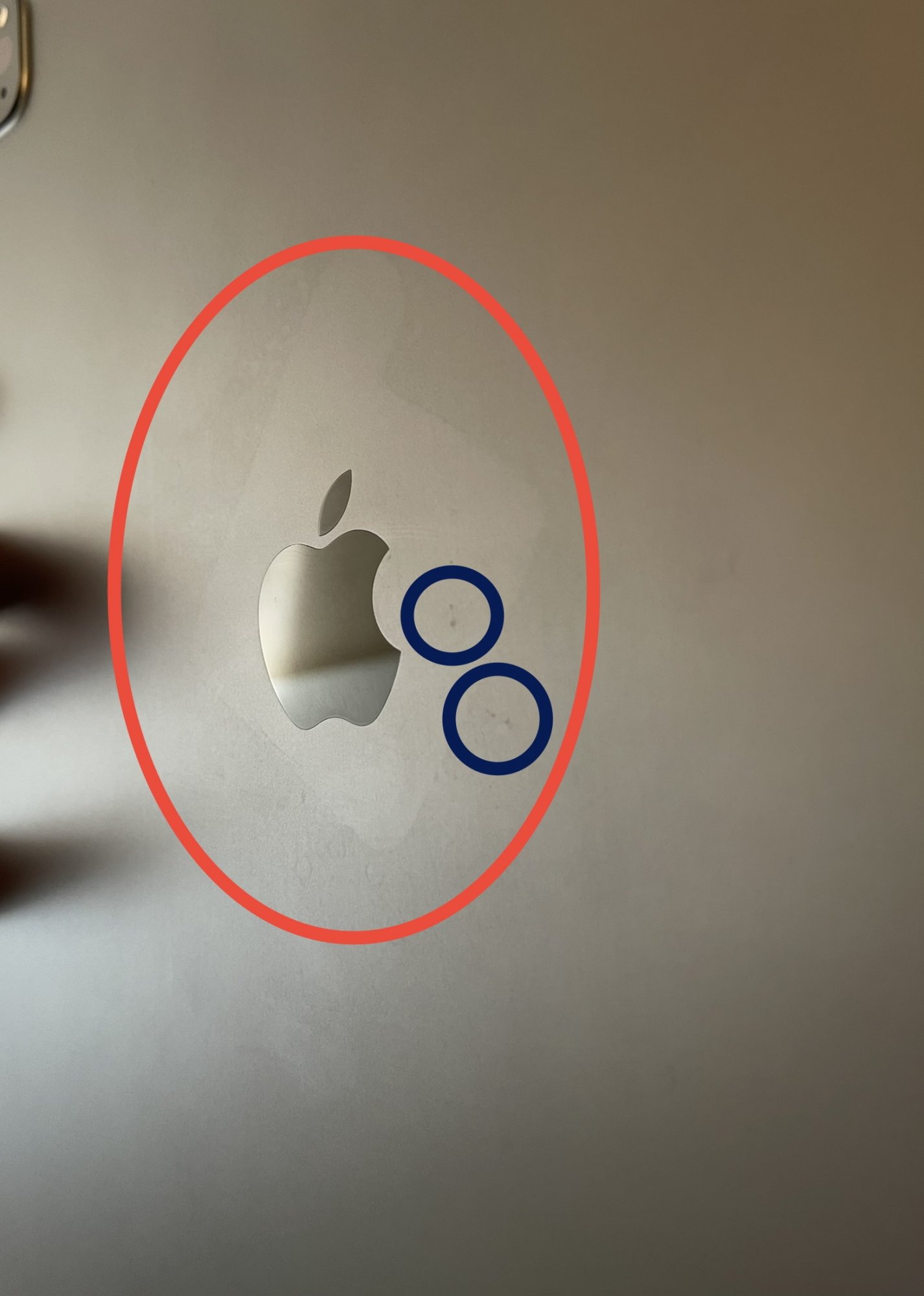 Thank you for the detailed response, you don’t work for apple do you? 🤔😂That’s the CNC seal which creates a seal to mill out the Apple logo, and the two dots are maybe cooling oil/liquid mixture that dripped but we’re allowed to sit too long and we’re absorbed since it wasn’t washed or wiped away fast enough.