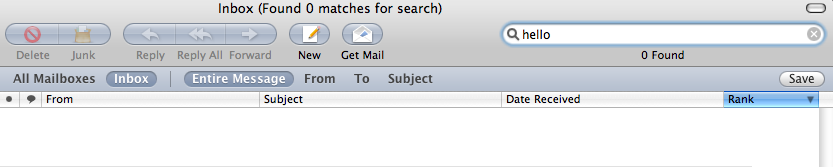 I can't get the search function in mail to work at all. I search for something like my name, or the subject of a letter I just looked at and no matter what it comes up with no results. What's up?