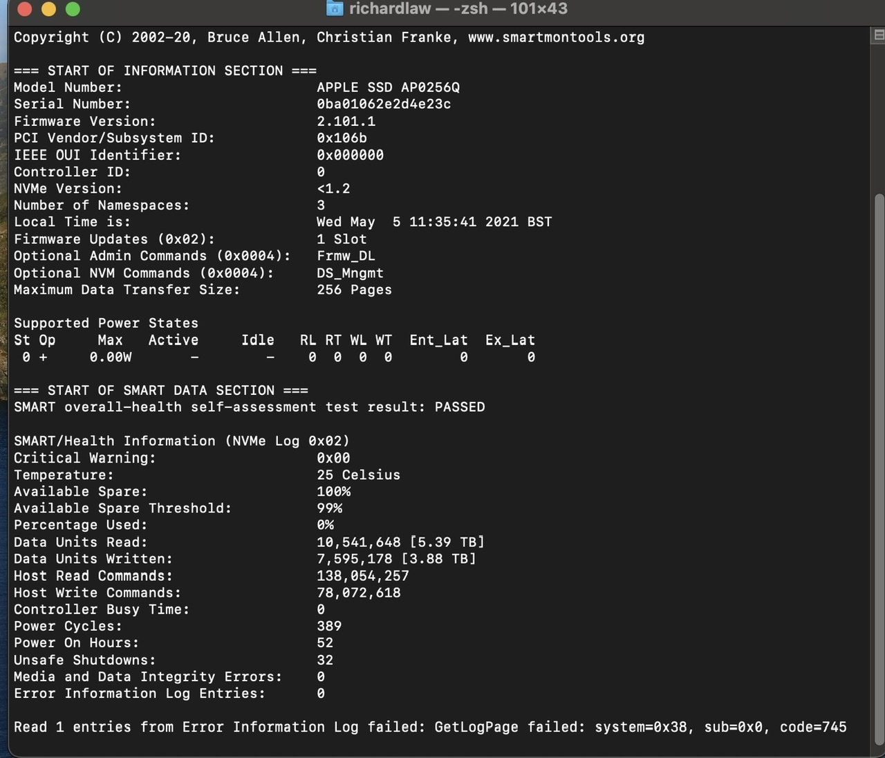 smartctl -a disk0. There is an installer package on GitHub that will install into /usr/local/bin after you supply your admin password: