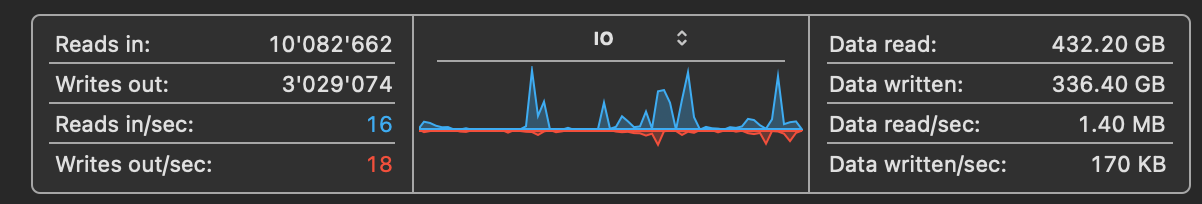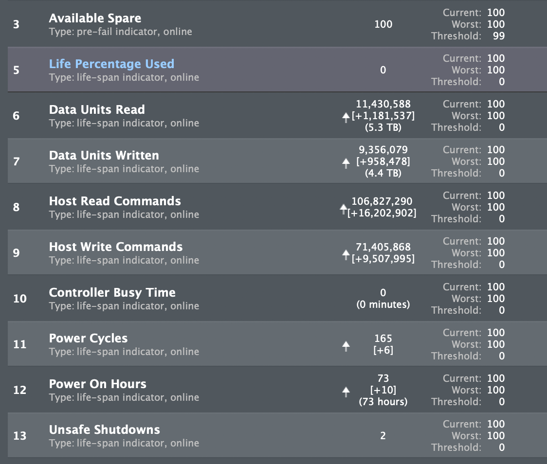 - TBW from Activity Monitor is 336Gb (12 hrs uptime)