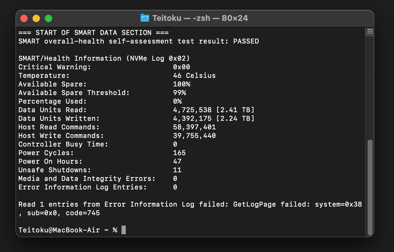 brew install smartmontools && sudo smartctl --all /dev/disk0How do we do these tests for ourselves? I'd like to compare my 2018 Mac Mini SSD to the one in my M1 Mac mini.