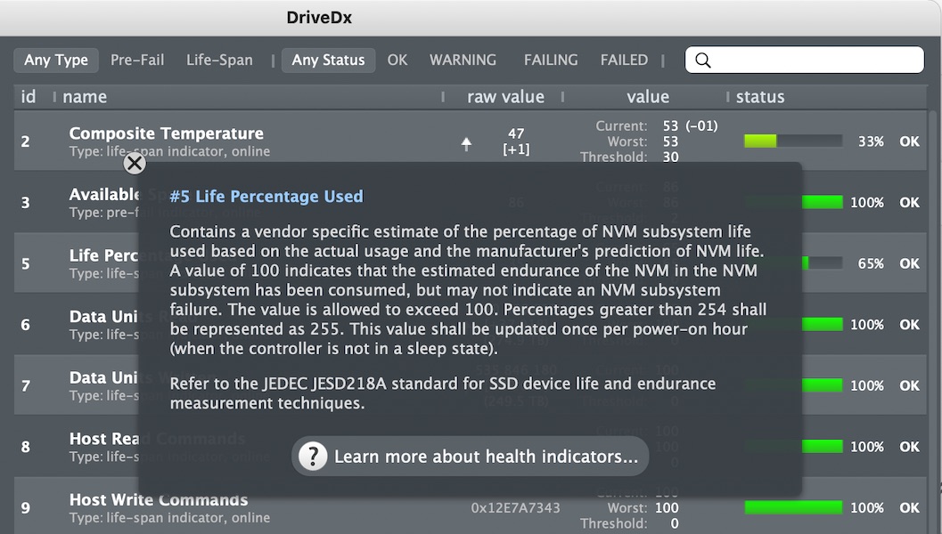 Thanks for your valuable discovery. But this information is already available to any user of DriveDx."Percentage Used: Contains a vendor specific estimate of the percentage of NVM subsystem life used based on the actual usage and the manufacturer’s prediction of NVM life. A value of 100 indicates that the estimated endurance of the NVM in the NVM subsystem has been consumed, but may not indicate an NVM subsystem failure. The value is allowed to exceed 100. Percentages greater than 254 shall be represented as 255. This value shall be updated once per power-on hour (when the controller is not in a sleep state)." - SMART Attribute Details