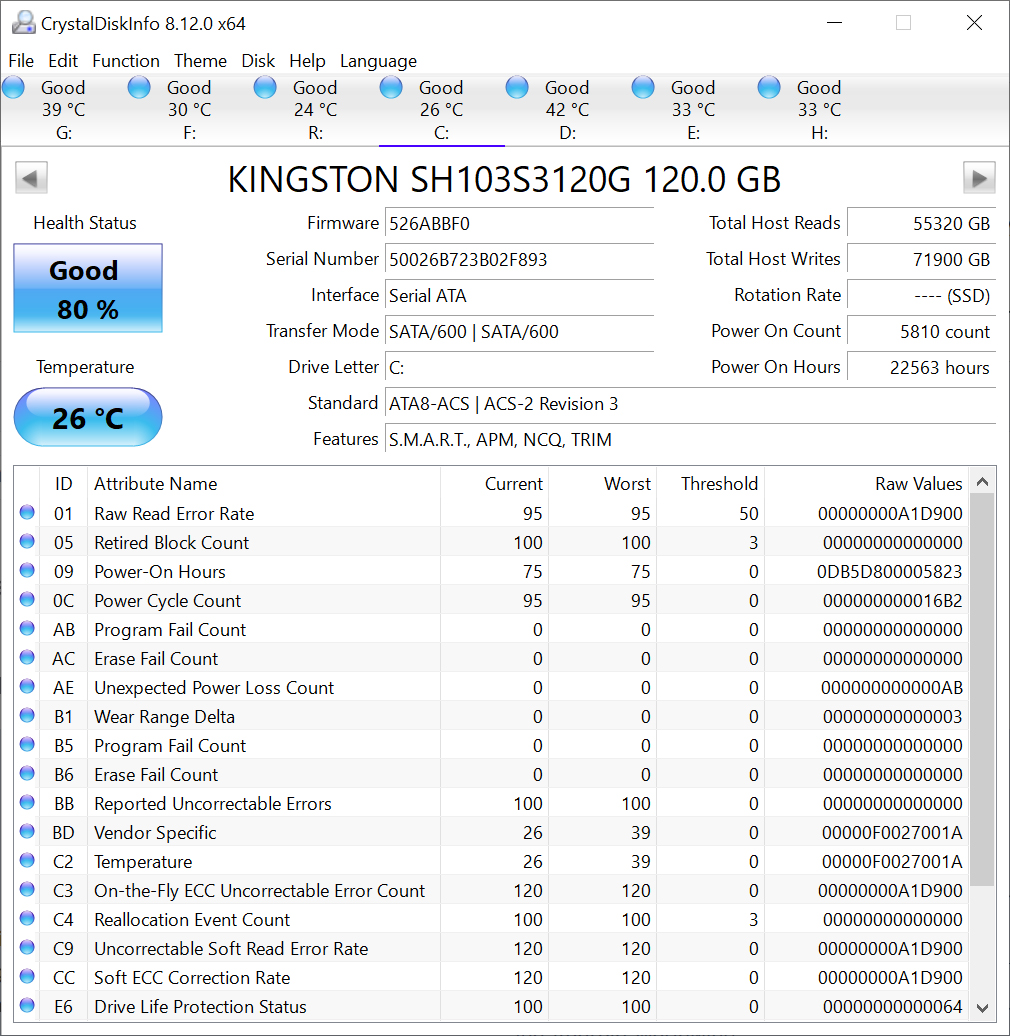 120GB.. and for TBW on Kingston site it says 40TB.. long past that number.