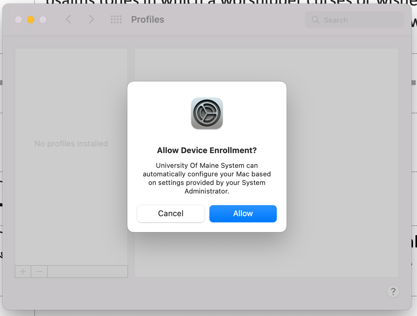After backing up from my Time Machine backup, my MBP now thinks that it belongs to the University of Maine and wants to enrol my MBP to add their software and tweaks. (I am not now, nor ever have been associated with the University of Maine.) See attached screenshot.
