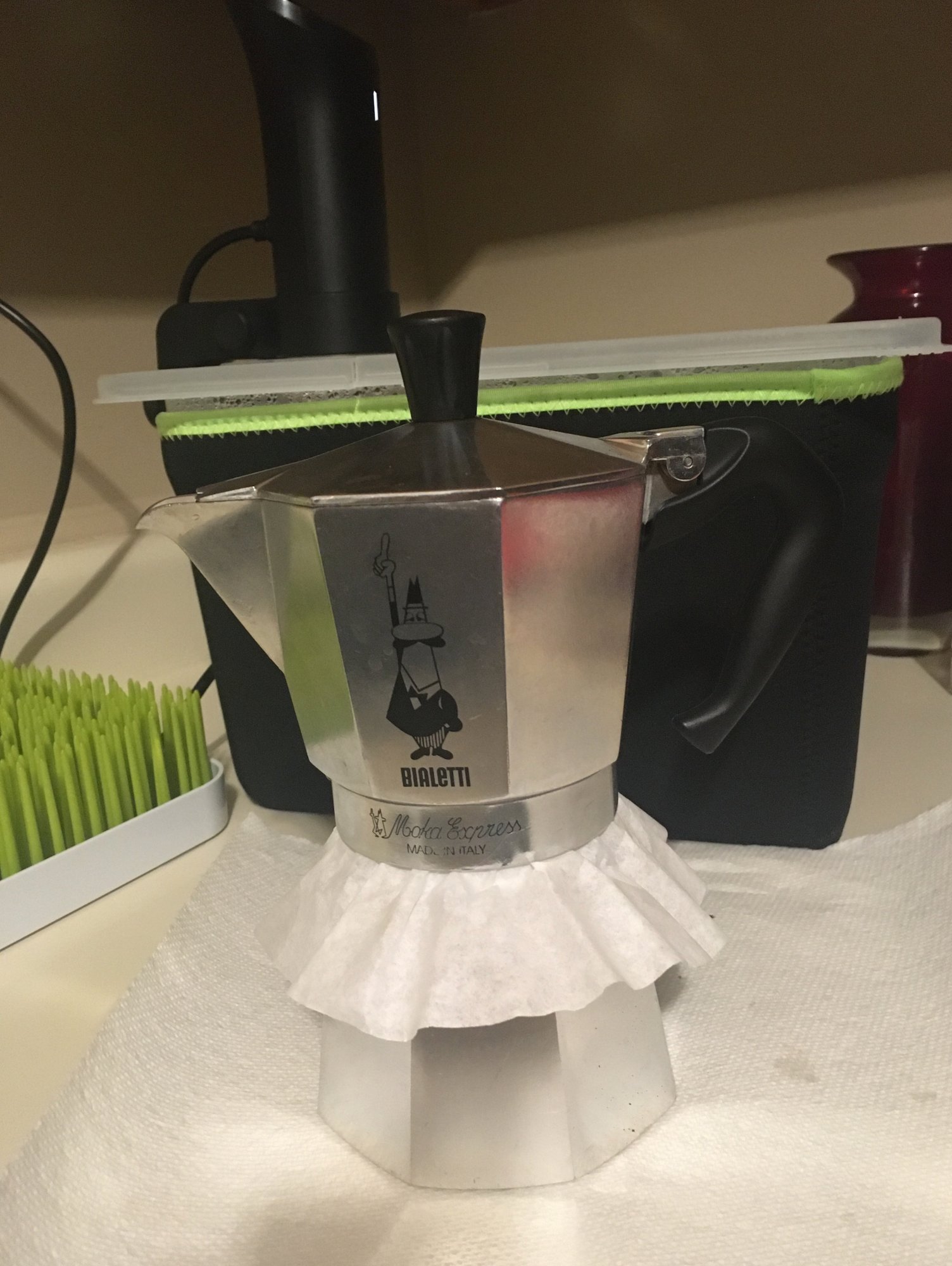 I use a drip brew coffee filter, placed in between the two half that screw together. It makes the Moka Pot look like it is wearing a little white skirt: