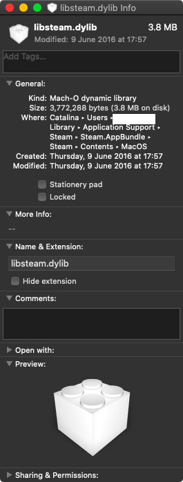Let's fix that. I managed to build a version of the "Goldberg Emulator" for Mac. This is a replacement library you can drop into a game's app bundle to make it work without Steam. Whenever the game asks Steam for a status update, the replacement library will pinky-promise that Steam is totally running right now, and everything is going just fine thank you very much. Source code (mostly recovered from a deleted gitlab branch) and build instructions are included in the package.