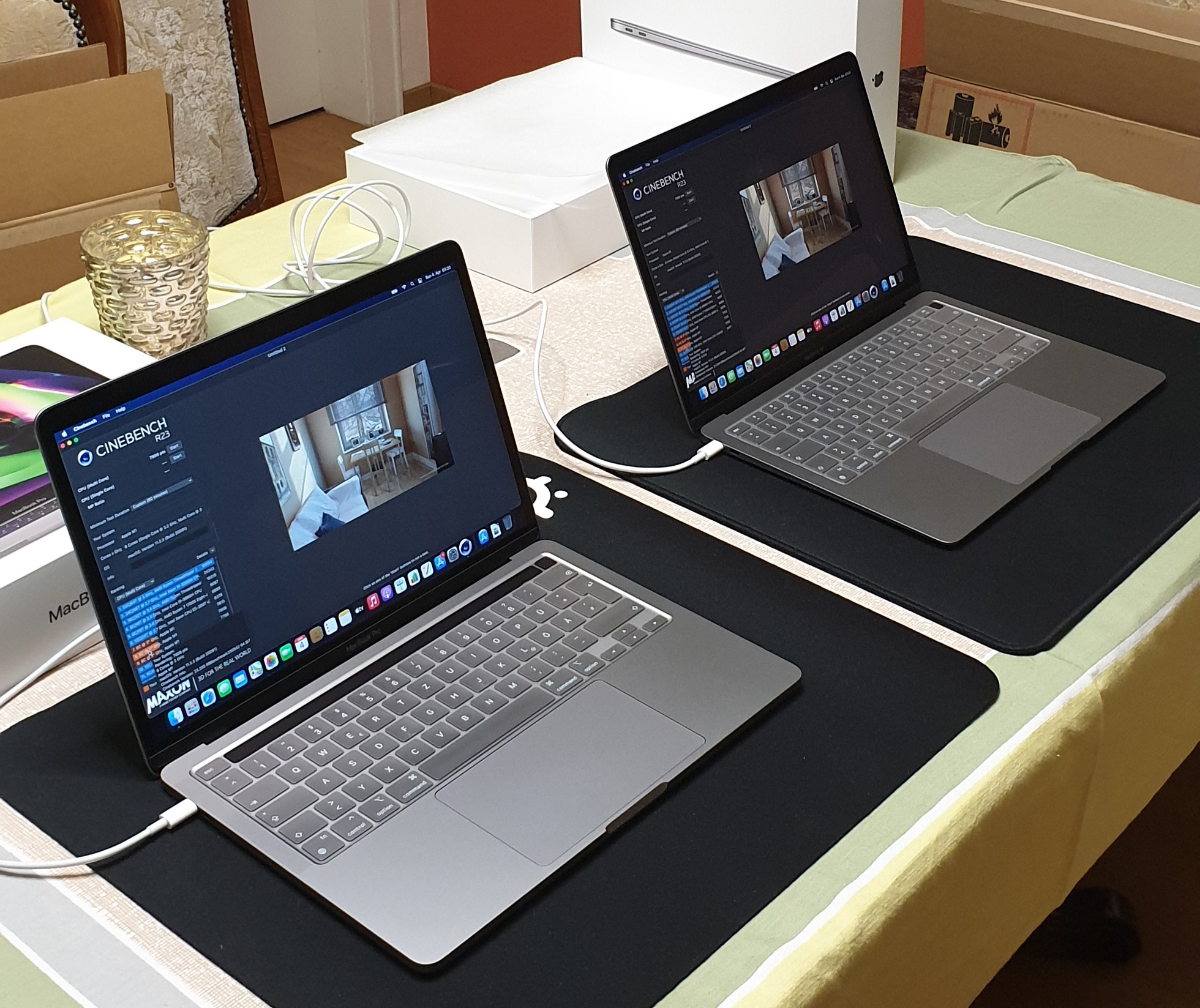 However, I would've chosen the Pro over the Air if I had scored 6600 points versus 7800 but after 2 hours of Cinebench, which is super unrealistic and hefty, the difference is 10% (7034 points versus 7805, maybe I have cought a well binned chip) and during a more reasonable hefty usage of 1 hour, the difference is 8% and the Air has even more battery life than the Pro, given that the Pro uses 25 watts under full load vs the Air max 15 Watts.