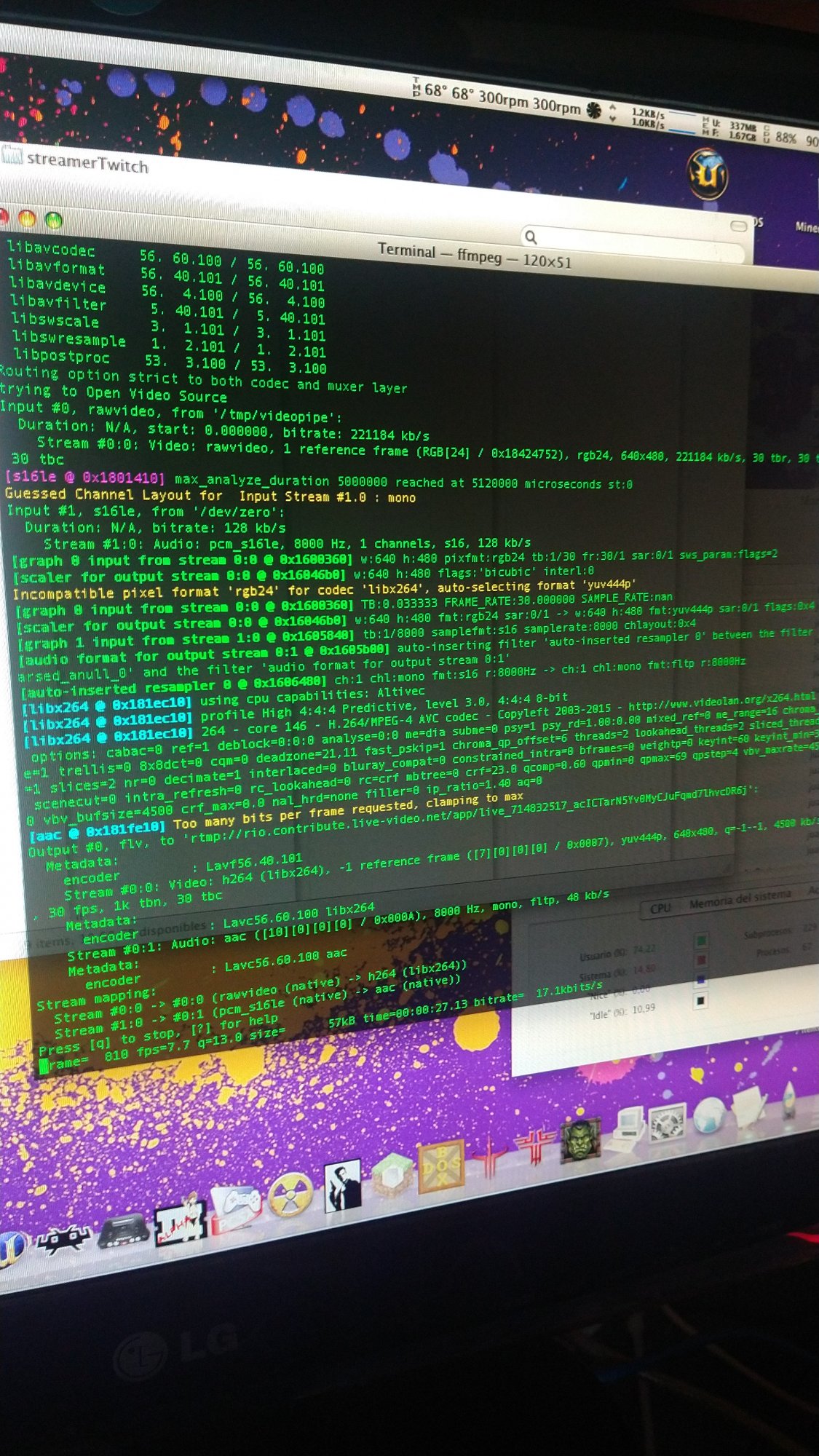 I just wanted to share than i successfully created a stream of a fixed color generated with numpy from my G5 running 10.5.8 to Twitch.tv using Python 3.6 and ffmpeg :))