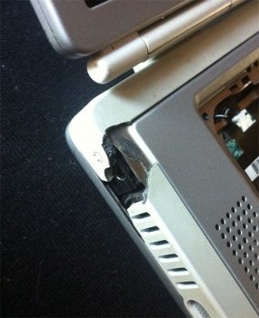 - PowerBook G4 Titanium 400Mhz - Cracked frame. Broken off chunk of frame at the optical slot and non-working DVD-ROM drive. No sound coming from the speakers.